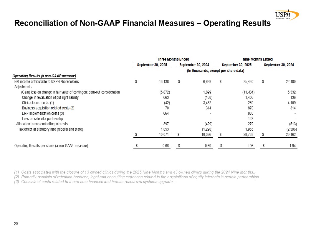 Reconciliation of Non-GAAP Financial Measures – Operating Results  28  Costs associated with the closure of 13 owned clinics during the 2025 Nine Months and 43 owned clinics during the 2024 Nine Months..  Primarily consists of retention bonuses, legal and consulting expenses related to the acquisitions of equity interests in certain partnerships.   Consists of costs related to a one-time financial and human resources systems upgrade. .