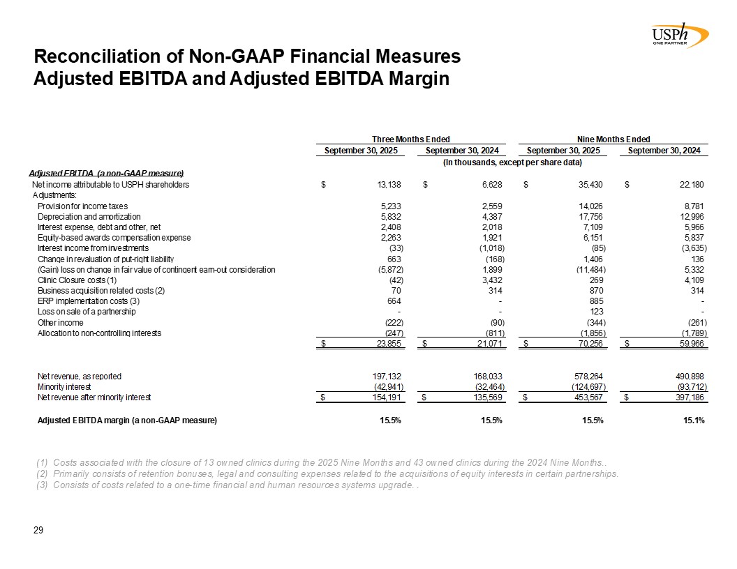 Reconciliation of Non-GAAP Financial Measures Adjusted EBITDA and Adjusted EBITDA Margin  29  Costs associated with the closure of 13 owned clinics during the 2025 Nine Months and 43 owned clinics during the 2024 Nine Months..  Primarily consists of retention bonuses, legal and consulting expenses related to the acquisitions of equity interests in certain partnerships.   Consists of costs related to a one-time financial and human resources systems upgrade. .