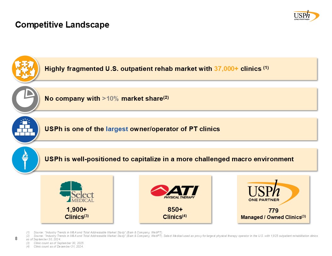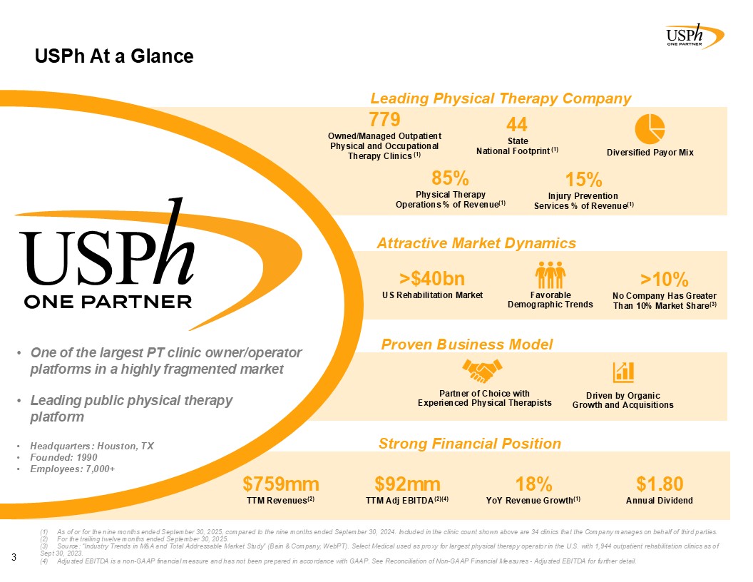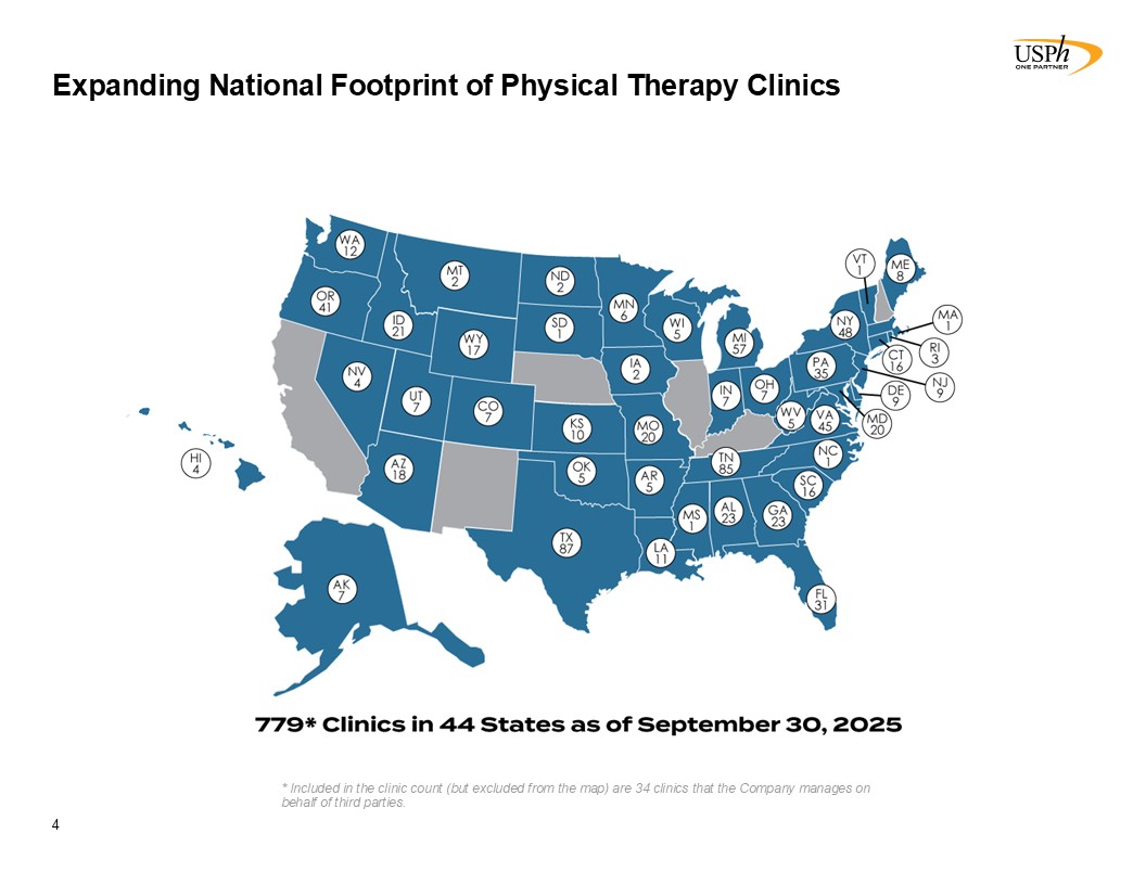 779  Owned/Managed Outpatient Physical and Occupational Therapy Clinics (1)  44  State   National Footprint (1)  85%  Physical Therapy   Operations % of Revenue(1)  15%  Injury Prevention   Services % of Revenue(1)  >$40bn  US Rehabilitation Market  >10%  No Company Has Greater Than 10% Market Share(3)  Partner of Choice with Experienced Physical Therapists  $759mm  TTM Revenues(2)  $92mm  TTM Adj EBITDA(2)(4)  18%  YoY Revenue Growth(1)  $1.80  Annual Dividend  Proven Business Model  Attractive Market Dynamics  Leading Physical Therapy Company  USPh At a Glance  Strong Financial Position  One of the largest PT clinic owner/operator platforms in a highly fragmented market   Leading public physical therapy platform  Headquarters: Houston, TX  Founded: 1990  Employees: 7,000+  Favorable Demographic Trends  As of or for the nine months ended September 30, 2025, compared to the nine months ended September 30, 2024. Included in the clinic count shown above are 34 clinics that the Company manages on behalf of third parties.   For the trailing twelve months ended September 30, 2025.  Source: “Industry Trends in M&A and Total Addressable Market Study” (Bain & Company, WebPT). Select Medical used as proxy for largest physical therapy operator in the U.S. with 1,944 outpatient rehabilitation clinics as of Sept 30, 2023.   Adjusted EBITDA is a non-GAAP financial measure and has not been prepared in accordance with GAAP. See Reconciliation of Non-GAAP Financial Measures - Adjusted EBITDA for further detail.  Driven by Organic Growth and Acquisitions  Diversified Payor Mix  3
