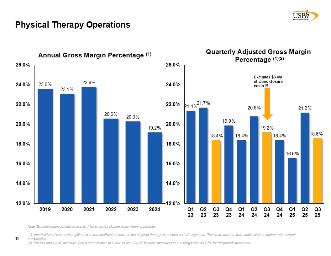 Physical Therapy Operations  18  Note: Excludes management contracts. Also excludes closure costs where applicable.  (1) Amortization of certain intangible assets was reallocated between the physical therapy operations and IIP segments. Prior year amounts were reallocated to conform with current presentation.  (2) This is a non-GAAP measure. See a reconciliation of GAAP to Non-GAAP financial measures in our filings with the SEC for the periods presented.  Annual Gross Margin Percentage (1)  Quarterly Adjusted Gross Margin   Percentage (1)(2)