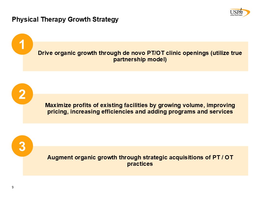 Competitive Landscape  8  Source: “Industry Trends in M&A and Total Addressable Market Study” (Bain & Company, WebPT).  Source: “Industry Trends in M&A and Total Addressable Market Study” (Bain & Company, WebPT). Select Medical used as proxy for largest physical therapy operator in the U.S. with 1,925 outpatient rehabilitation clinics as of September 30, 2024.   Clinic count as of September 30, 2025.  Clinic count as of December 31, 2024.  1,900+  Clinics(3)  850+  Clinics(4)  779  Managed / Owned Clinics(3)  Highly fragmented U.S. outpatient rehab market with 37,000+ clinics (1)   USPh is one of the largest owner/operator of PT clinics  No company with >10% market share(2)  USPh is well-positioned to capitalize in a more challenged macro environment