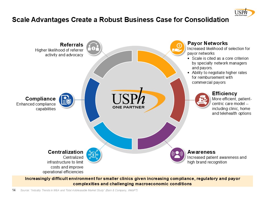 Scale Advantages Create a Robust Business Case for Consolidation  14  Increased likelihood of selection for payor networks  Scale is cited as a core criterion by specialty network managers and payors.  Some limited leverage in negotiations with payors for reimbursement  Higher likelihood of referrer activity and advocacy  More efficient, patient-centric care model -- including clinic, home and telehealth options  Enhanced compliance capabilities  Centralized infrastructure to limit costs and improve operational efficiencies  Increased patient awareness and high brand recognition  Source: “Industry Trends in M&A and Total Addressable Market Study” (Bain & Company, WebPT)  Efficiency  More efficient, patient-centric care model -- including clinic, home and telehealth options  Compliance  Enhanced compliance capabilities  Payor Networks  Increased likelihood of selection for payor networks  Scale is cited as a core criterion by specialty network managers and payors.  Ability to negotiate higher rates for reimbursement with commercial payors  Referrals  Higher likelihood of referrer activity and advocacy  Centralization  Centralized infrastructure to limit costs and improve operational efficiencies  Awareness  Increased patient awareness and high brand recognition  Increasingly difficult environment for smaller clinics given increasing compliance, regulatory and payor complexities and challenging macroeconomic conditions