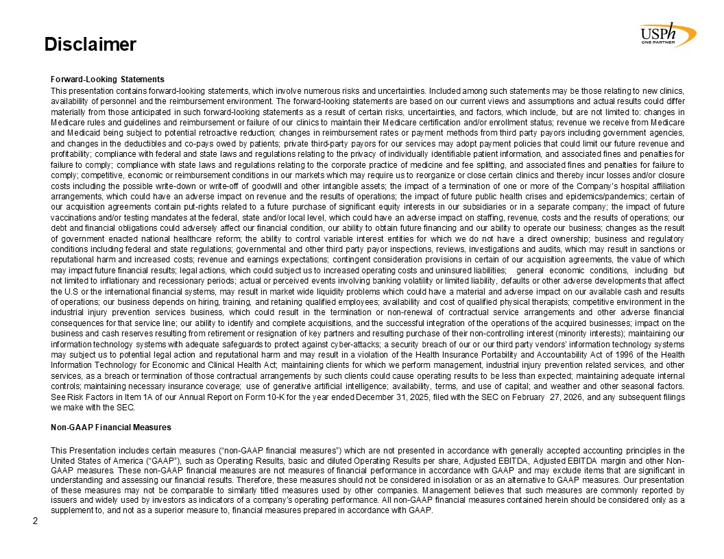 Disclaimer  2  Forward-Looking Statements   This presentation contains forward-looking statements, which involve numerous risks and uncertainties. Included among such statements may be those relating to new clinics, availability of personnel and the reimbursement environment. The forward-looking statements are based on our current views and assumptions and actual results could differ materially from those anticipated in such forward-looking statements as a result of certain risks, uncertainties, and factors, which include, but are not limited to: changes in Medicare rules and guidelines and reimbursement or failure of our clinics to maintain their Medicare certification and/or enrollment status; revenue we receive from Medicare and Medicaid being subject to potential retroactive reduction; changes in reimbursement rates or payment methods from third party payors including government agencies, and changes in the deductibles and co-pays owed by patients; private third-party payors for our services may adopt payment policies that could limit our future revenue and profitability; compliance with federal and state laws and regulations relating to the privacy of individually identifiable patient information, and associated fines and penalties for failure to comply; compliance with state laws and regulations relating to the corporate practice of medicine and fee splitting, and associated fines and penalties for failure to comply; competitive, economic or reimbursement conditions in our markets which may require us to reorganize or close certain clinics and thereby incur losses and/or closure costs including the possible write-down or write-off of goodwill and other intangible assets; the impact of a termination of one or more of the Company’s hospital affiliation arrangements, which could have an adverse impact on revenue and the results of operations; the impact of future public health crises and epidemics/pandemics; certain of our acquisition agreements contain put-rights related to a future purchase of significant equity interests in our subsidiaries or in a separate company; the impact of future vaccinations and/or testing mandates at the federal, state and/or local level, which could have an adverse impact on staffing, revenue, costs and the results of operations; our debt and financial obligations could adversely affect our financial condition, our ability to obtain future financing and our ability to operate our business; changes as the result of government enacted national healthcare reform; the ability to control variable interest entities for which we do not have a direct ownership; business and regulatory conditions including federal and state regulations; governmental and other third party payor inspections, reviews, investigations and audits, which may result in sanctions or reputational harm and increased costs; revenue and earnings expectations; contingent consideration provisions in certain of our acquisition agreements, the value of which may impact future financial results; legal actions, which could subject us to increased operating costs and uninsured liabilities; general economic conditions, including but not limited to inflationary and recessionary periods; actual or perceived events involving banking volatility or limited liability, defaults or other adverse developments that affect the U.S or the international financial systems, may result in market wide liquidity problems which could have a material and adverse impact on our available cash and results of operations; our business depends on hiring, training, and retaining qualified employees; availability and cost of qualified physical therapists; competitive environment in the industrial injury prevention services business, which could result in the termination or non-renewal of contractual service arrangements and other adverse financial consequences for that service line; our ability to identify and complete acquisitions, and the successful integration of the operations of the acquired businesses; impact on the business and cash reserves resulting from retirement or resignation of key partners and resulting purchase of their non-controlling interest (minority interests); maintaining our information technology systems with adequate safeguards to protect against cyber-attacks; a security breach of our or our third party vendors’ information technology systems may subject us to potential legal action and reputational harm and may result in a violation of the Health Insurance Portability and Accountability Act of 1996 of the Health Information Technology for Economic and Clinical Health Act; maintaining clients for which we perform management, industrial injury prevention related services, and other services, as a breach or termination of those contractual arrangements by such clients could cause operating results to be less than expected; maintaining adequate internal controls; maintaining necessary insurance coverage; use of generative artificial intelligence; availability, terms, and use of capital; and weather and other seasonal factors. See Risk Factors in Item 1A of our Annual Report on Form 10-K for the year ended December 31, 2025, filed with the SEC on February 27, 2026, and any subsequent filings we make with the SEC.  Non-GAAP Financial Measures  This Presentation includes certain measures (“non-GAAP financial measures”) which are not presented in accordance with generally accepted accounting principles in the United States of America (“GAAP”), such as Operating Results, basic and diluted Operating Results per share, Adjusted EBITDA, Adjusted EBITDA margin and other Non-GAAP measures. These non-GAAP financial measures are not measures of financial performance in accordance with GAAP and may exclude items that are significant in understanding and assessing our financial results. Therefore, these measures should not be considered in isolation or as an alternative to GAAP measures. Our presen