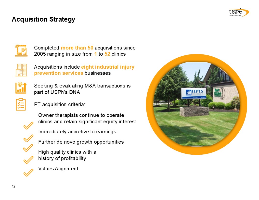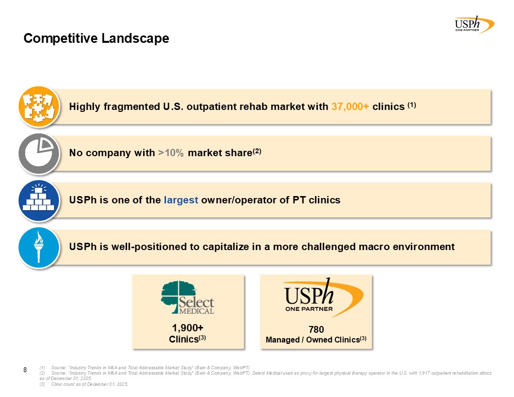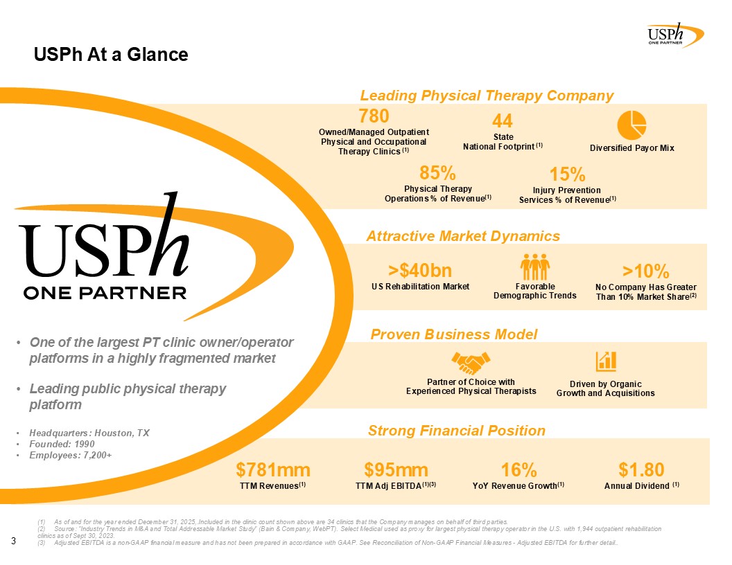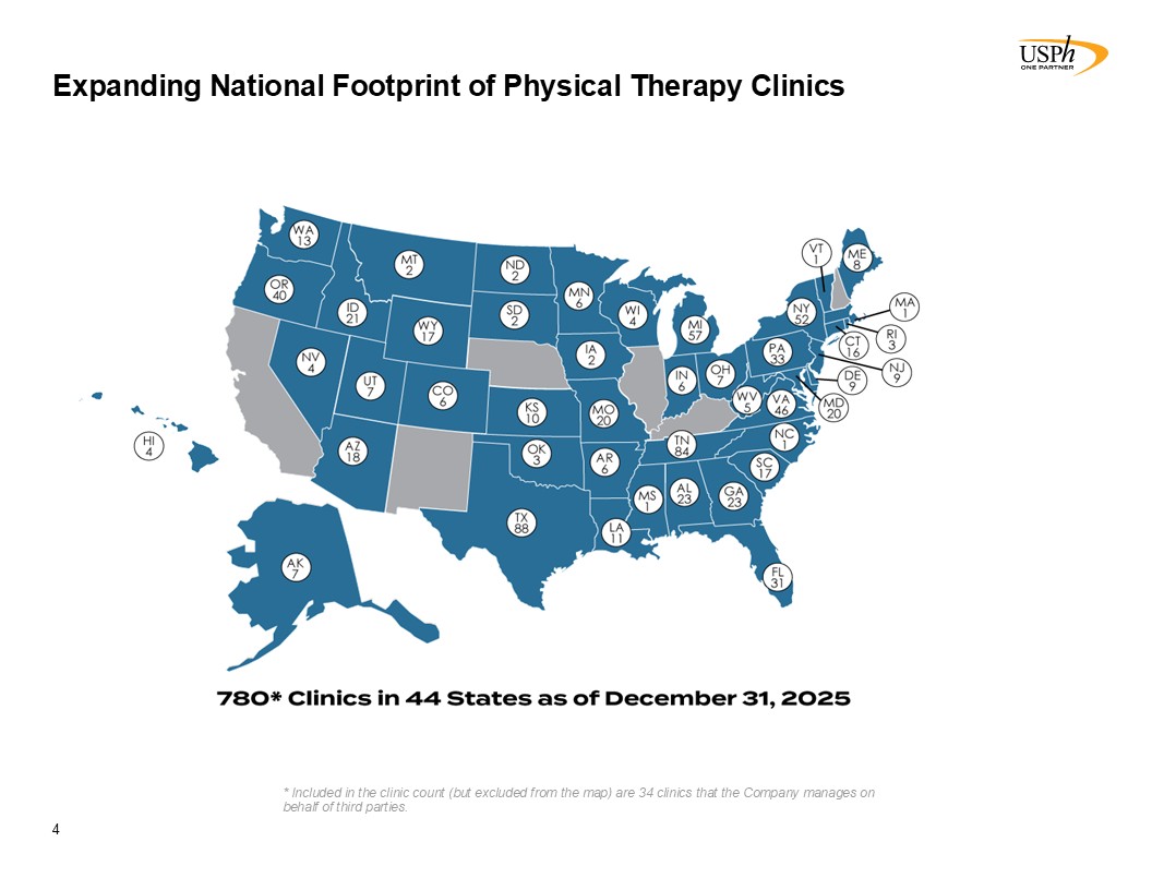 780  Owned/Managed Outpatient Physical and Occupational Therapy Clinics (1)  44  State   National Footprint (1)  85%  Physical Therapy   Operations % of Revenue(1)  15%  Injury Prevention   Services % of Revenue(1)  >$40bn  US Rehabilitation Market  >10%  No Company Has Greater Than 10% Market Share(2)  Partner of Choice with Experienced Physical Therapists  $781mm  TTM Revenues(1)  $95mm  TTM Adj EBITDA(1)(3)  16%  YoY Revenue Growth(1)  $1.80  Annual Dividend (1)   Proven Business Model  Attractive Market Dynamics  Leading Physical Therapy Company  USPh At a Glance  Strong Financial Position  One of the largest PT clinic owner/operator platforms in a highly fragmented market   Leading public physical therapy platform  Headquarters: Houston, TX  Founded: 1990  Employees: 7,200+  Favorable Demographic Trends  As of and for the year ended December 31, 2025,.Included in the clinic count shown above are 34 clinics that the Company manages on behalf of third parties.   Source: “Industry Trends in M&A and Total Addressable Market Study” (Bain & Company, WebPT). Select Medical used as proxy for largest physical therapy operator in the U.S. with 1,944 outpatient rehabilitation clinics as of Sept 30, 2023.   Adjusted EBITDA is a non-GAAP financial measure and has not been prepared in accordance with GAAP. See Reconciliation of Non-GAAP Financial Measures - Adjusted EBITDA for further detail..  Driven by Organic Growth and Acquisitions  Diversified Payor Mix  3