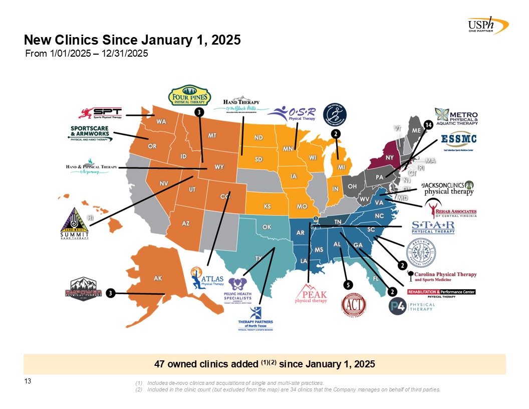 Acquisition Strategy  12  Completed more than 50 acquisitions since 2005 ranging in size from 1 to 52 clinics  Acquisitions include eight industrial injury prevention services businesses  Seeking & evaluating M&A transactions is part of USPh’s DNA  PT acquisition criteria:  Owner therapists continue to operate clinics and retain significant equity interest  Immediately accretive to earnings  Further de novo growth opportunities  High quality clinics with a history of profitability  Values Alignment