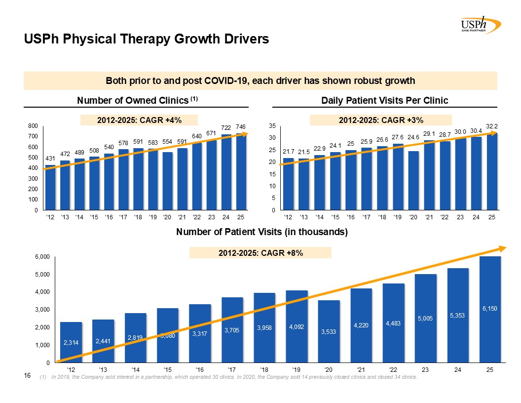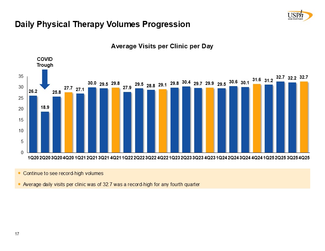 USPh Physical Therapy Growth Drivers  16  In 2019, the Company sold interest in a partnership, which operated 30 clinics. In 2020, the Company sold 14 previously closed clinics and closed 34 clinics.   Number of Owned Clinics (1)  Daily Patient Visits Per Clinic   Number of Patient Visits (in thousands)  Both prior to and post COVID-19, each driver has shown robust growth  2012-2025: CAGR +4%  2012-2025: CAGR +3%  2012-2025: CAGR +8%