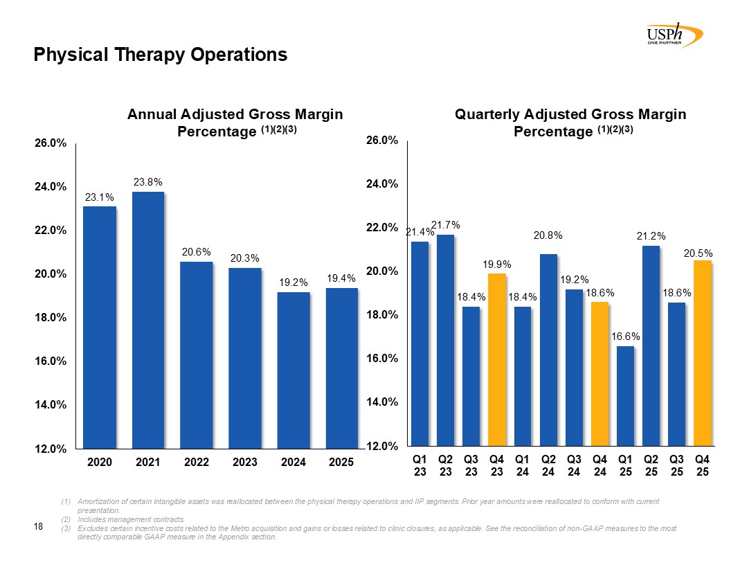 Physical Therapy Operations  18  Amortization of certain intangible assets was reallocated between the physical therapy operations and IIP segments. Prior year amounts were reallocated to conform with current presentation.  Includes management contracts.  Excludes certain incentive costs related to the Metro acquisition and gains or losses related to clinic closures, as applicable. See the reconciliation of non-GAAP measures to the most directly comparable GAAP measure in the Appendix section.  Annual Adjusted Gross Margin   Percentage (1)(2)(3)  Quarterly Adjusted Gross Margin   Percentage (1)(2)(3)