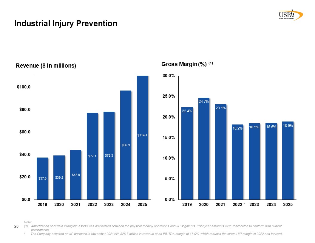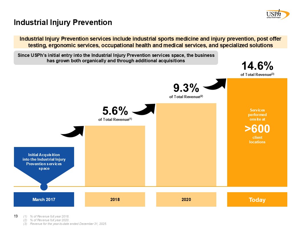 Today  Services performed onsite at >600  client locations  Industrial Injury Prevention  19  Industrial Injury Prevention services include industrial sports medicine and injury prevention, post offer testing, ergonomic services, occupational health and medical services, and specialized solutions  March 2017  2020  14.6%   of Total Revenue(3)  Since USPh’s initial entry into the Industrial Injury Prevention services space, the business has grown both organically and through additional acquisitions  % of Revenue full year 2018.  % of Revenue full year 2020.  Revenue for the year-to-date ended December 31, 2025.   5.6%   of Total Revenue(1)  9.3%   of Total Revenue(2)  Initial Acquisition   into the Industrial Injury Prevention services   space  2018