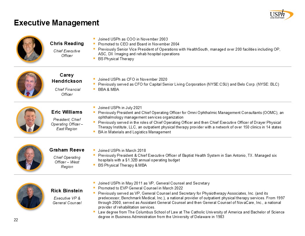 Executive Management  22  https://www.usph.com/about/senior-leadership/  https://www.linkedin.com/in/rick-binstein-66944512  Joined USPh as CFO in November 2020  Previously served as CFO for Capital Senior Living Corporation (NYSE:CSU) and Belo Corp. (NYSE: BLC)  BBA & MBA  Carey Hendrickson   Chief Financial Officer  Joined USPh in March 2018  Previously President & Chief Executive Officer of Baptist Health System in San Antonio, TX. Managed six hospitals with a $1.32B annual operating budget  BS Physical Therapy & MBA  Graham Reeve   Chief Operating Officer – West Region  Joined USPh in July 2021  Previously President and Chief Operating Officer for Omni Ophthalmic Management Consultants (OOMC), an ophthalmology management services organization  Previously served in the roles of Chief Operating Officer and then Chief Executive Officer of Drayer Physical Therapy Institute, LLC, an outpatient physical therapy provider with a network of over 150 clinics in 14 states  BA in Materials and Logistics Management  Eric Williams   President, Chief Operating Officer – East Region  Joined USPh in May 2011 as VP, General Counsel and Secretary  Promoted to EVP General Counsel in March 2022   Previously served as VP, General Counsel and Secretary for Physiotherapy Associates, Inc. (and its predecessor, Benchmark Medical, Inc.), a national provider of outpatient physical therapy services. From 1997 through 2000, served as Assistant General Counsel and then General Counsel of NovaCare, Inc., a national provider of rehabilitation services.   Law degree from The Columbus School of Law at The Catholic University of America and Bachelor of Science degree in Business Administration from the University of Delaware in 1983  Rick Binstein   Executive VP & General Counsel  Joined USPh as COO in November 2003  Promoted to CEO and Board in November 2004  Previously Senior Vice President of Operations with HealthSouth, managed over 200 facilities including OP, ASC, DX Imaging and rehab hospital operations  BS Physical Therapy  Chris Reading  Chief Executive Officer