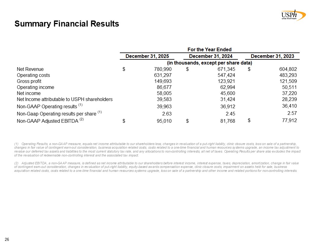 Summary Financial Results  26  Operating Results, a non-GAAP measure, equals net income attributable to our shareholders less, changes in revaluation of a put-right liability, clinic closure costs, loss on sale of a partnership, changes in fair value of contingent earn-out consideration, business acquisition related costs, costs related to a one-time financial and human resources systems upgrade, an income tax adjustment to revalue our deferred tax assets and liabilities to the most current statutory tax rate, and any allocations to non-controlling interests, all net of taxes. Operating Results per share also excludes the impact of the revaluation of redeemable non-controlling interest and the associated tax impact.  Adjusted EBITDA, a non-GAAP measure, is defined as net income attributable to our shareholders before interest income, interest expense, taxes, depreciation, amortization, change in fair value of contingent earn-out consideration, changes in revaluation of put-right liability, equity-based awards compensation expense, clinic closure costs, impairment on assets held for sale, business acquisition related costs, costs related to a one-time financial and human resources systems upgrade, loss on sale of a partnership and other income and related portions for non-controlling interests.