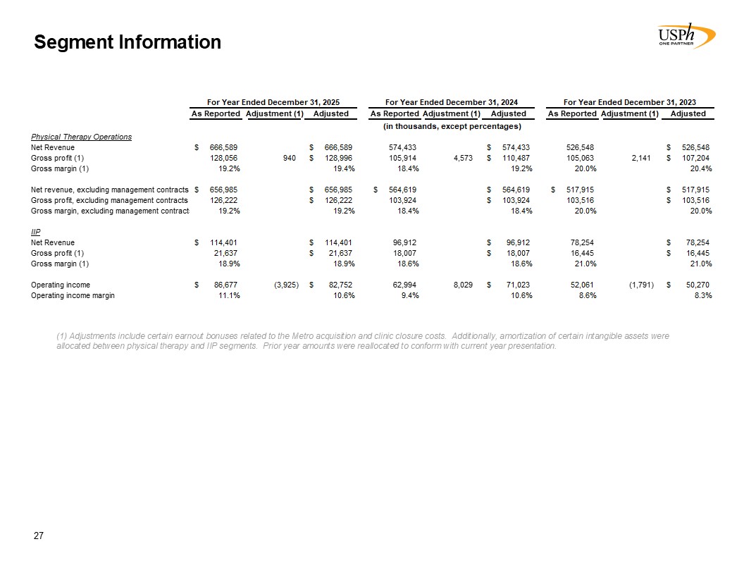 Segment Information  27  (1) Adjustments include certain earnout bonuses related to the Metro acquisition and clinic closure costs. Additionally, amortization of certain intangible assets were allocated between physical therapy and IIP segments. Prior year amounts were reallocated to conform with current year presentation.