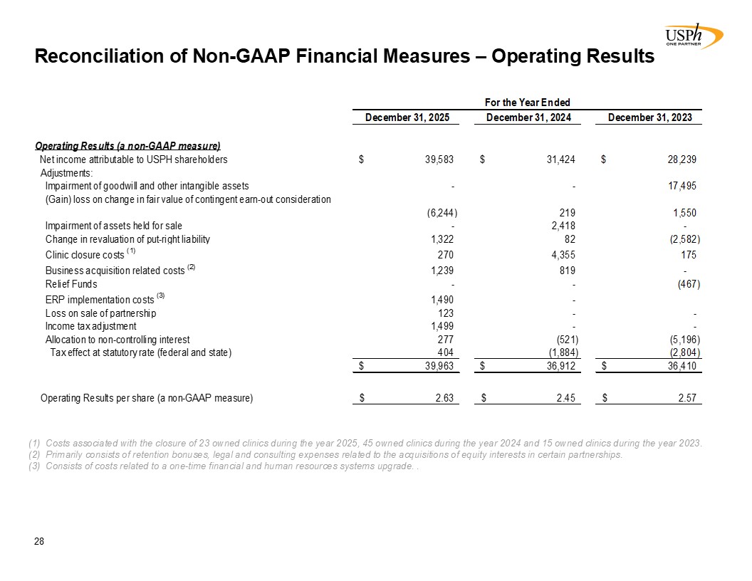 Reconciliation of Non-GAAP Financial Measures – Operating Results  28  Costs associated with the closure of 23 owned clinics during the year 2025, 45 owned clinics during the year 2024 and 15 owned clinics during the year 2023.  Primarily consists of retention bonuses, legal and consulting expenses related to the acquisitions of equity interests in certain partnerships.   Consists of costs related to a one-time financial and human resources systems upgrade. .