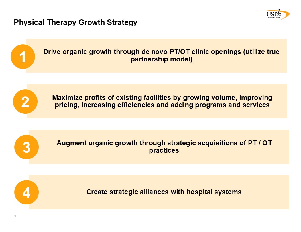 Competitive Landscape  8  Source: “Industry Trends in M&A and Total Addressable Market Study” (Bain & Company, WebPT).  Source: “Industry Trends in M&A and Total Addressable Market Study” (Bain & Company, WebPT). Select Medical used as proxy for largest physical therapy operator in the U.S. with 1,917 outpatient rehabilitation clinics as of December 31, 2025.   Clinic count as of December 31, 2025.  1,900+  Clinics(3)  780  Managed / Owned Clinics(3)  Highly fragmented U.S. outpatient rehab market with 37,000+ clinics (1)   USPh is one of the largest owner/operator of PT clinics  No company with >10% market share(2)  USPh is well-positioned to capitalize in a more challenged macro environment