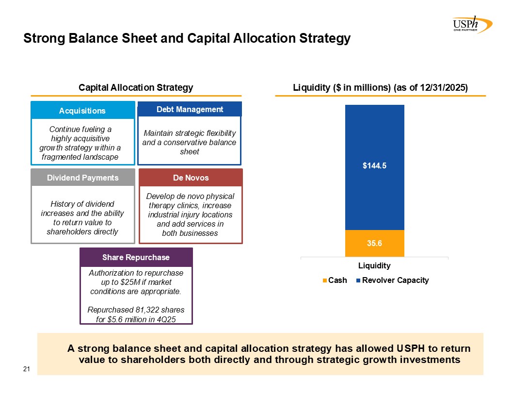 Strong Balance Sheet and Capital Allocation Strategy  21  At June 30, 2024, we had $112.9 million in cash and $142.5 million outstanding on our term loan. We have $175 million available for borrowings under our revolving facility.  A strong balance sheet and capital allocation strategy has allowed USPH to return value to shareholders both directly and through strategic growth investments  In 2023, the Company generated Adjusted EBITDA(1) of $77.7 million  Liquidity ($ in millions) (as of 06/30/24)  Acquisitions  Continue fueling a highly acquisitive growth strategy within a fragmented landscape  Maintain strategic flexibility and a conservative balance sheet   Debt Management  Capital Allocation Strategy  History of dividend increases and the ability to return value to shareholders directly   Dividend Issuances  Debt Management  Minimize interest expense and maintain strategic flexibility  Liquidity ($ in millions) (as of 12/31/2025)  Dividend Payments  History of dividend increases and the ability to return value to shareholders directly   De Novos  Develop de novo physical therapy clinics, increase industrial injury locations and add services in   both businesses  Share Repurchase  Authorization to repurchase up to $25M if market conditions are appropriate.  Repurchased 81,322 shares for $5.6 million in 4Q25