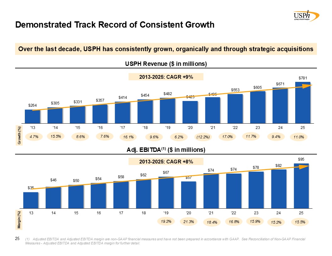 Transaction Overview  Demonstrated Track Record of Consistent Growth  Over the last decade, USPH has consistently grown, organically and through strategic acquisitions  USPH Revenue ($ in millions)  Adj. EBITDA(1) ($ in millions)  4.7%  15.5%  8.6%  7.6%  16.1%  9.6%  6.2%  (12.2%)  17.0%  11.7%  16.8%  15.9%  25  Growth (%)  Margin (%)  2013-2025: CAGR +8%  2013-2025: CAGR +9%  Adjusted EBITDA and Adjusted EBITDA margin are non-GAAP financial measures and have not been prepared in accordance with GAAP. See Reconciliation of Non-GAAP Financial Measures - Adjusted EBITDA and Adjusted EBITDA margin for further detail.  9.4%  15.2%  11.0%  15.5%  19.2 %  21.3%  18.4%