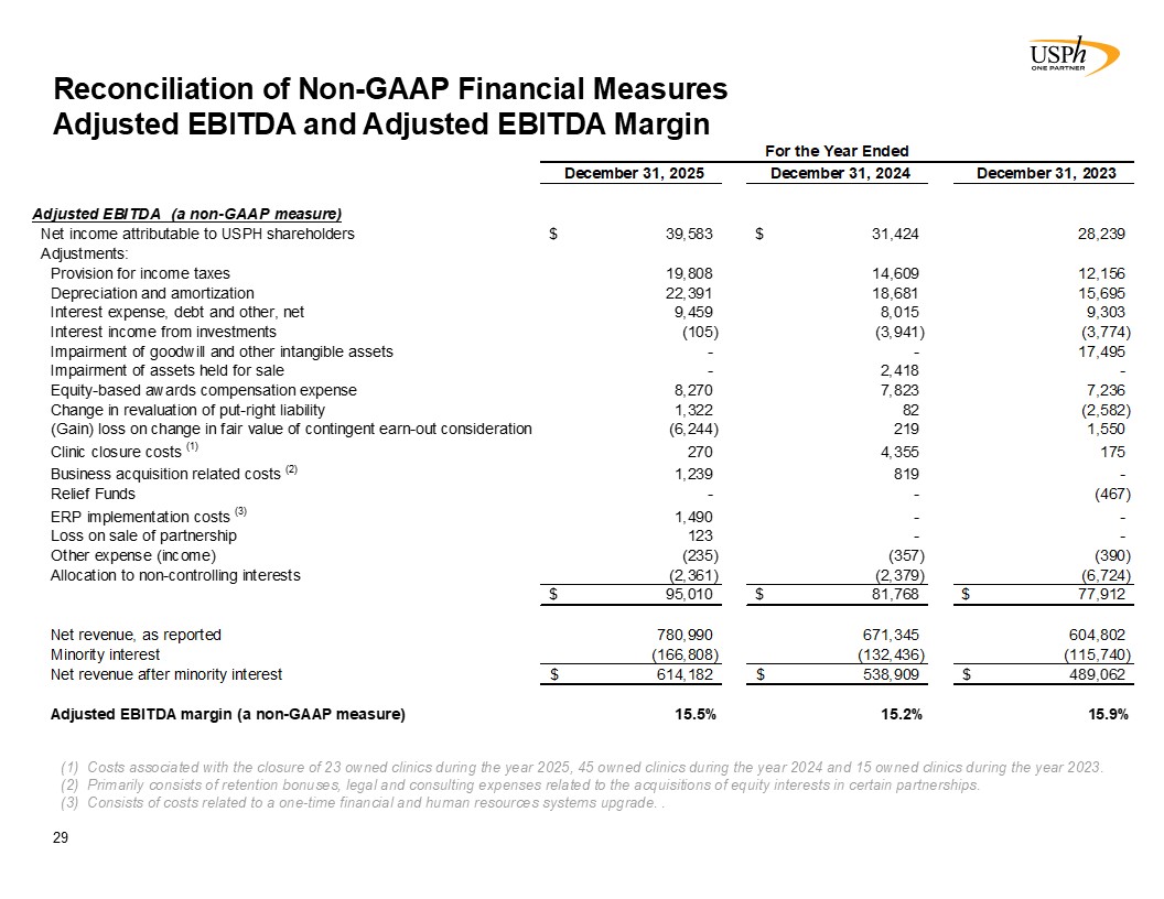 Reconciliation of Non-GAAP Financial Measures Adjusted EBITDA and Adjusted EBITDA Margin  29  Costs associated with the closure of 23 owned clinics during the year 2025, 45 owned clinics during the year 2024 and 15 owned clinics during the year 2023.  Primarily consists of retention bonuses, legal and consulting expenses related to the acquisitions of equity interests in certain partnerships.   Consists of costs related to a one-time financial and human resources systems upgrade. .