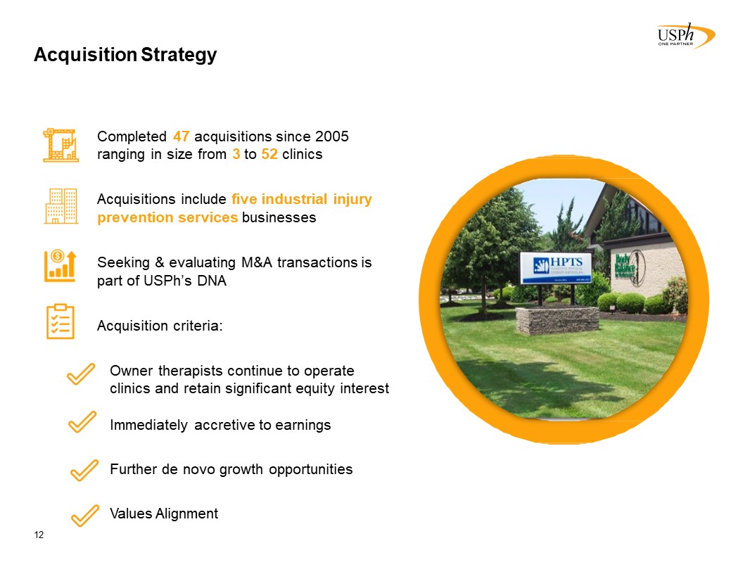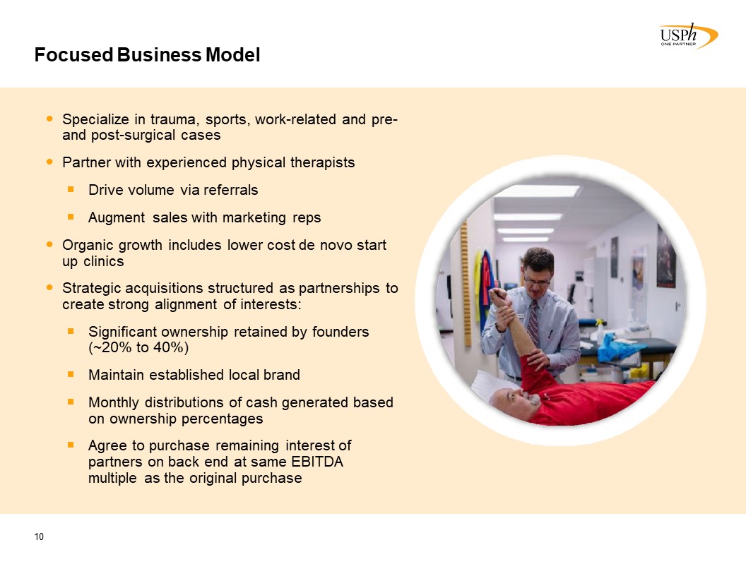 Focused Business Model  Specialize in trauma, sports, work-related and pre- and post-surgical cases  Partner with experienced physical therapists  Drive volume via referrals  Augment sales with marketing reps  Organic growth includes lower cost de novo start up clinics  Strategic acquisitions structured as partnerships to create strong alignment of interests:  Significant ownership retained by founders (~20% to 40%)  Maintain established local brand  Monthly distributions of cash generated based on ownership percentages  Agree to purchase remaining interest of partners on back end at same EBITDA multiple as the original purchase  12