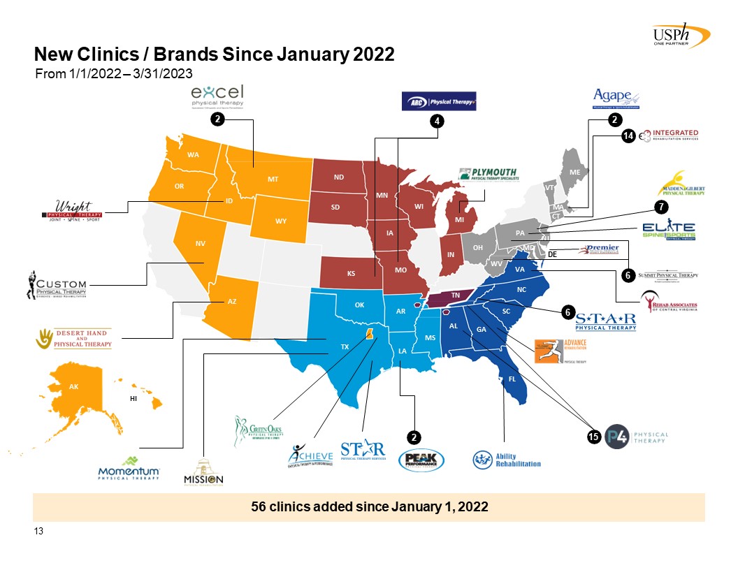 Growth Strategy  Drive organic growth through de novo PT/OT clinic openings, utilize true partnership model  Maximize profits of existing facilities by growing patient volume, improving  pricing, increasing efficiencies and adding programs and services  Augment organic growth through strategic acquisitions  1  2  3  12
