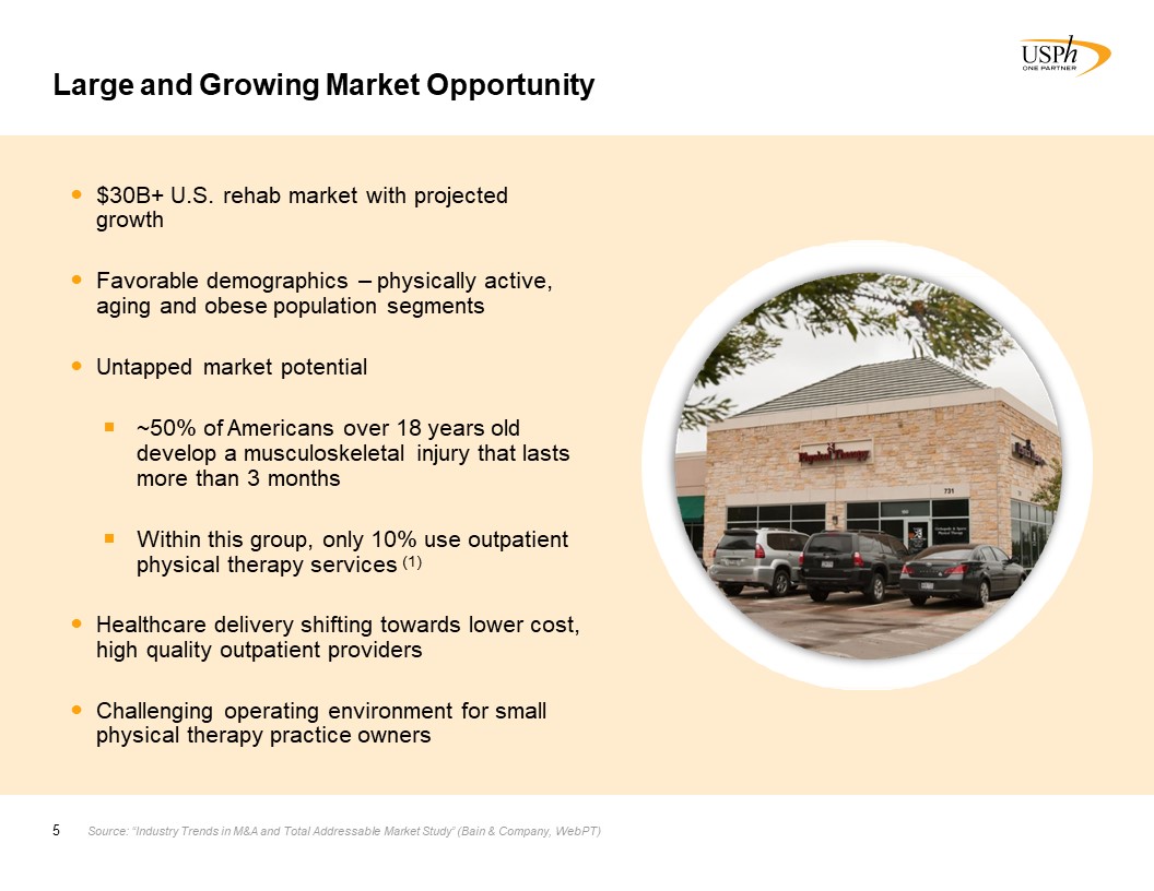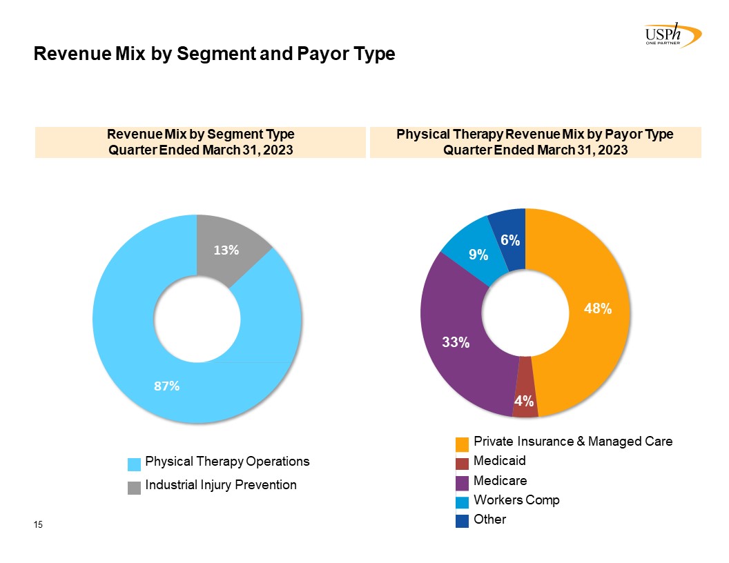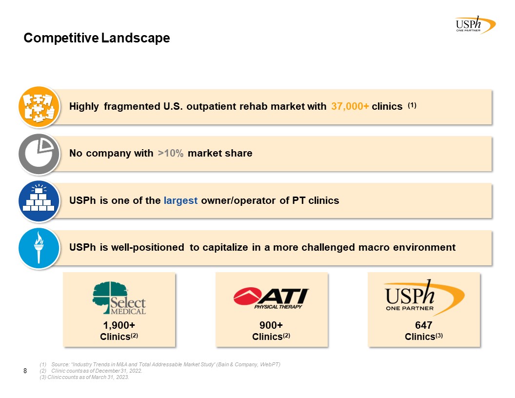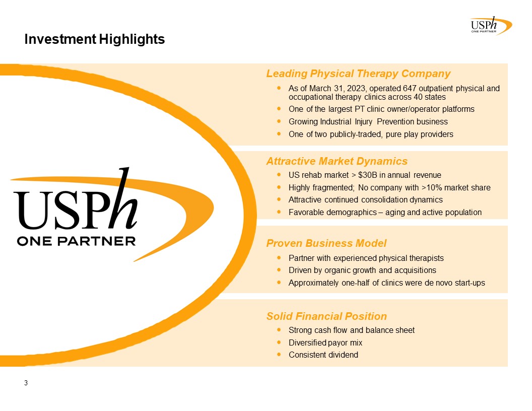 Investment Highlights  Leading Physical Therapy Company  As of March 31, 2023, operated 647 outpatient physical and occupational therapy clinics across 40 states  One of the largest PT clinic owner/operator platforms  Growing Industrial Injury Prevention business  One of two publicly-traded, pure play providers  Attractive Market Dynamics  US rehab market > $30B in annual revenue  Highly fragmented; No company with >10% market share  Attractive continued consolidation dynamics  Favorable demographics – aging and active population  Proven Business Model  Partner with experienced physical therapists  Driven by organic growth and acquisitions  Approximately one-half of clinics were de novo start-ups  Solid Financial Position  Strong cash flow and balance sheet  Diversified payor mix  Consistent dividend  2