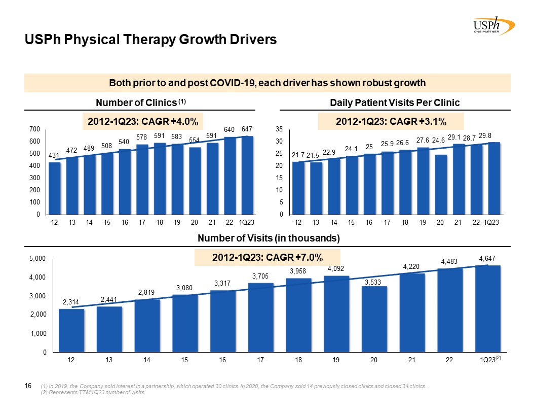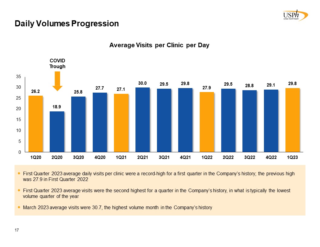 USPh Physical Therapy Growth Drivers  431  472  489  508  540  591  578 583  554  591  640  647  700  600  500  400  300  200  100  0  2,314  2,441  2,819  3,080  3,317  3,705  3,958  4,092  3,533  4,220  4,483  4,647  2,000  1,000  0  3,000  4,000  5,000  12  13  14  15  16  17  18  19  20  21  22  21.7 21.5 22.9  24.1  25  25.9 26.6  27.6 24.6 29.1 28.7 29.8  35  30  25  20  15  10  5  0  12 13 14 15 16 17 18 19 20 21 22 1Q23 12 13 14  15 16 17 18 19 20 21 22 1Q23  16 (1) In 2019, the Company sold interest in a partnership, which operated 30 clinics. In 2020, the Company sold 14 previously closed clinics and closed 34 clinics.  (2) Represents TTM 1Q23 number of visits.  Number of Clinics (1) Daily Patient Visits Per Clinic  Number of Visits (in thousands)  Both prior to and post COVID-19, each driver has shown robust growth  2012-1Q23: CAGR +4.0%  2012-1Q23: CAGR +3.1%  2012-1Q23: CAGR +7.0%  1Q23(2)