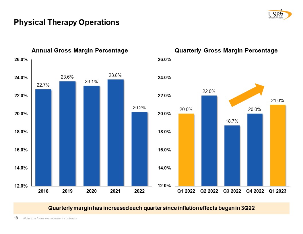 Daily Volumes Progression  17  First Quarter 2023 average daily visits per clinic were a record-high for a first quarter in the Company’s history; the previous high was 27.9 in First Quarter 2022  First Quarter 2023 average visits were the second highest for a quarter in the Company’s history, in what is typically the lowest volume quarter of the year  March 2023 average visits were 30.7, the highest volume month in the Company’s history  26.2  18.9  25.8  27.7  27.1  30.0  29.5  29.8  27.9  29.5  28.8  29.1  29.8  20  25  30  35  15  10  5  0  1Q20 2Q20 3Q20 4Q20 1Q21 2Q21 3Q21 4Q21 1Q22 2Q22 3Q22 4Q22 1Q23  COVID  Trough  Average Visits per Clinic per Day