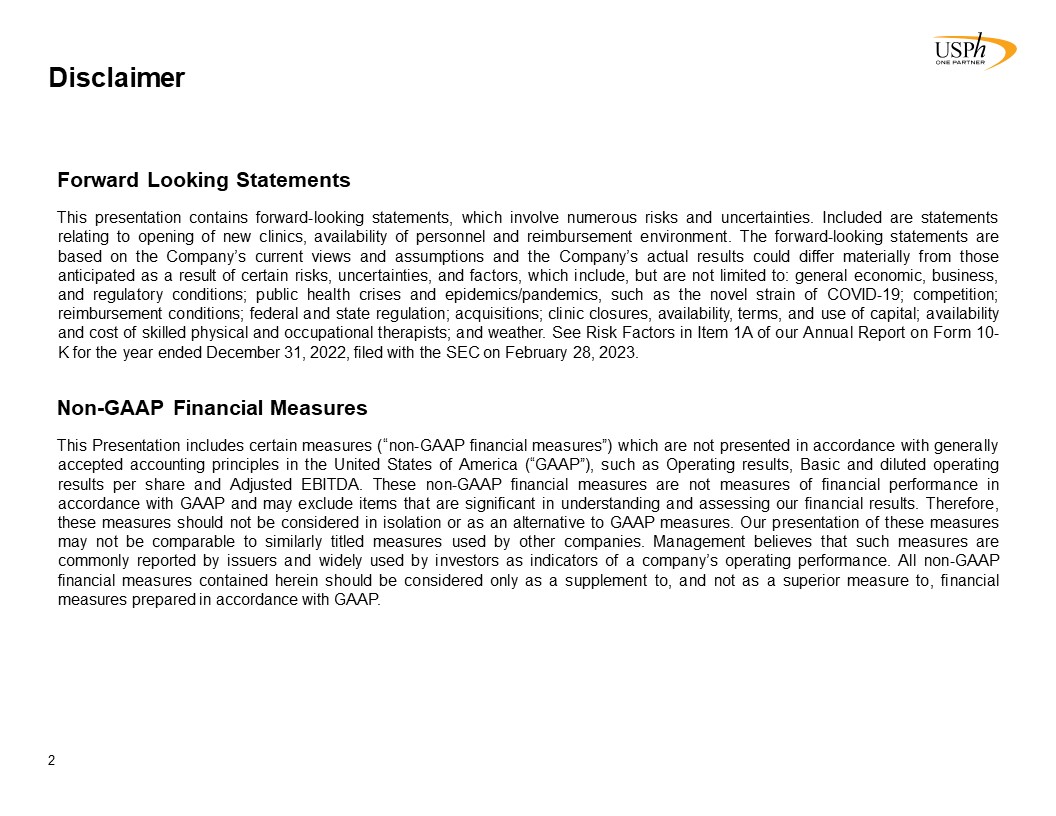 Disclaimer  2  Forward Looking Statements  This presentation contains forward-looking statements, which involve numerous risks and uncertainties. Included are statements relating to opening of new clinics, availability of personnel and reimbursement environment. The forward-looking statements are based on the Company’s current views and assumptions and the Company’s actual results could differ materially from those anticipated as a result of certain risks, uncertainties, and factors, which include, but are not limited to: general economic, business, and regulatory conditions; public health crises and epidemics/pandemics, such as the novel strain of COVID-19; competition; reimbursement conditions; federal and state regulation; acquisitions; clinic closures, availability, terms, and use of capital; availability and cost of skilled physical and occupational therapists; and weather. See Risk Factors in Item 1A of our Annual Report on Form 10- K for the year ended December 31, 2022, filed with the SEC on February 28, 2023.  Non-GAAP Financial Measures  This Presentation includes certain measures (“non-GAAP financial measures”) which are not presented in accordance with generally accepted accounting principles in the United States of America (“GAAP”), such as Operating results, Basic and diluted operating results per share and Adjusted EBITDA. These non-GAAP financial measures are not measures of financial performance in accordance with GAAP and may exclude items that are significant in understanding and assessing our financial results. Therefore, these measures should not be considered in isolation or as an alternative to GAAP measures. Our presentation of these measures may not be comparable to similarly titled measures used by other companies. Management believes that such measures are commonly reported by issuers and widely used by investors as indicators of a company’s operating performance. All non-GAAP financial measures contained herein should be considered only as a supplement to, and not as a superior measure to, financial measures prepared in accordance with GAAP.