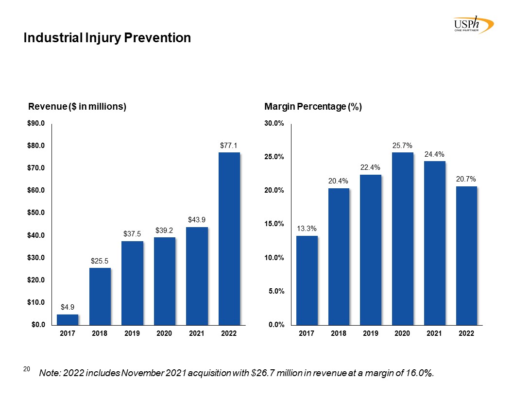 Today  Services performed onsite at  >600  client locations  Industrial Injury Prevention  19  Industrial Injury Prevention services include industrial sports medicine and injury prevention; post offer testing; ergonomic services; occupational health and medical services; specialized solutions  March 2017  2020  13.0%  of Total Revenue(3)  Since USPh’s initial entry into the Industrial Injury Prevention services space, the business has grown both organically and through additional acquisitions  % of Revenue full year 2018.  % of Revenue full year 2020.  Revenue as of Q1 ending March 31, 2023.  5.6%  of Total Revenue(1)  9.3%  of Total Revenue(2)  Initial Acquisition  into the Industrial Injury Prevention services space  2018