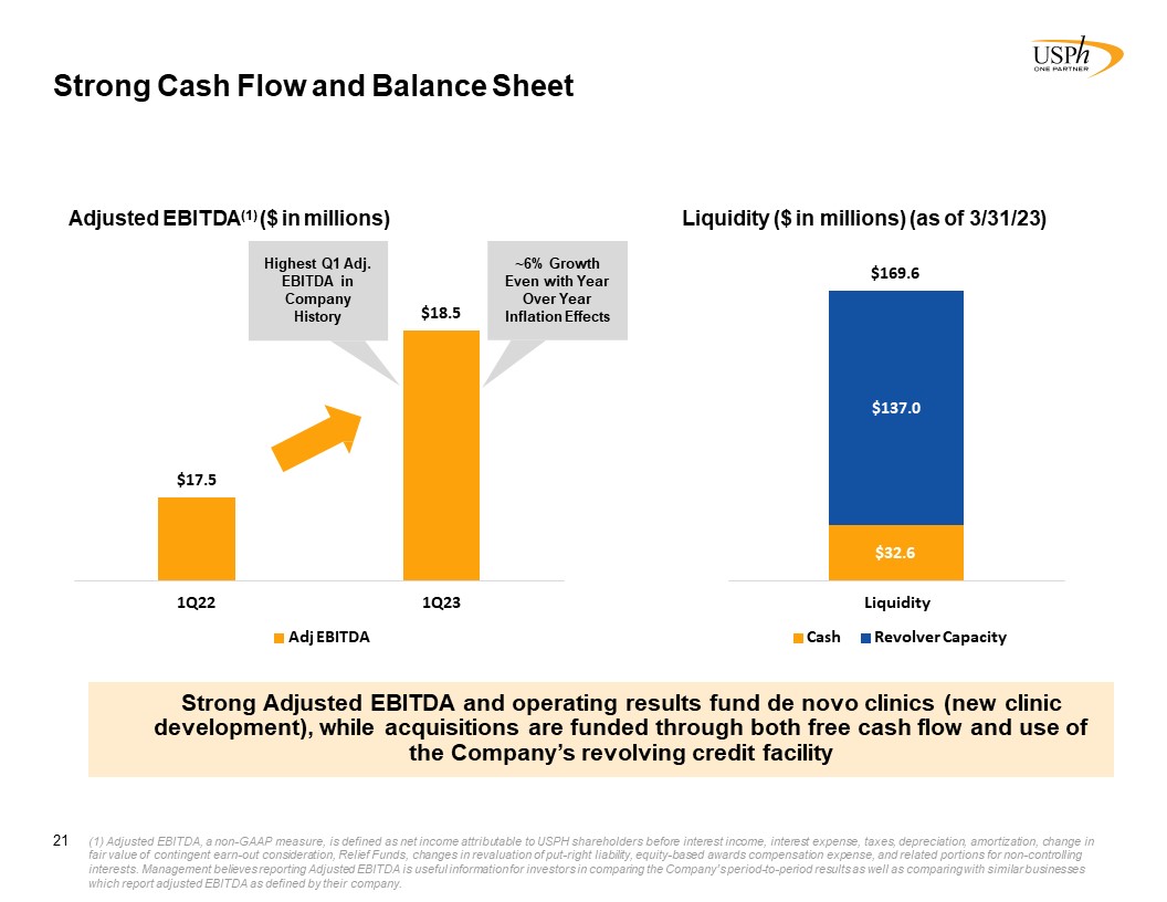 Strong Cash Flow and Balance Sheet  Strong Adjusted EBITDA and operating results fund de novo clinics (new clinic development), while acquisitions are funded through both free cash flow and use of the Company’s revolving credit facility  21 (1) Adjusted EBITDA, a non-GAAP measure, is defined as net income attributable to USPH shareholders before interest income, interest expense, taxes, depreciation, amortization, change in  fair value of contingent earn-out consideration, Relief Funds, changes in revaluation of put-right liability, equity-based awards compensation expense, and related portions for non-controlling  interests. Management believes reporting Adjusted EBITDA is useful information for investors in comparing the Company’s period-to-period results as well as comparing with similar businesses which report adjusted EBITDA as defined by their company.  $32.6  $137.0  $169.6  Liquidity  Cash  Revolver Capacity  Liquidity ($ in millions) (as of 3/31/23)  $17.5  $18.5  1Q22  1Q23  Adj EBITDA  Adjusted EBITDA(1) ($ in millions)  Highest Q1 Adj.  EBITDA in  Company History  ~6% Growth Even with Year Over Year Inflation Effects