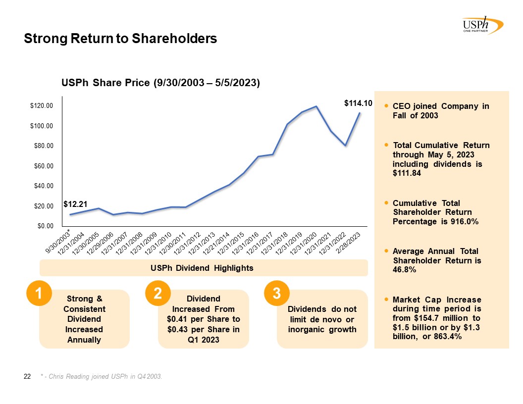 Strong Return to Shareholders  $12.21  $114.10  $0.00  $20.00  $40.00  $60.00  $80.00  $100.00  $120.00  *  CEO joined Company in Fall of 2003  Total Cumulative Return through May 5, 2023 including dividends is  $111.84  Cumulative Total Shareholder Return Percentage is 916.0%  Average Annual Total Shareholder Return is 46.8%  Market Cap Increase during time period is from $154.7 million to  $1.5 billion or by $1.3 billion, or 863.4%  USPh Share Price (9/30/2003 – 5/5/2023)  Strong & Consistent Dividend Increased Annually  1  Dividend Increased From  $0.41 per Share to  $0.43 per Share in  Q1 2023  2  Dividends do not limit de novo or inorganic growth  3  USPh Dividend Highlights  22 * - Chris Reading joined USPh in Q4 2003.