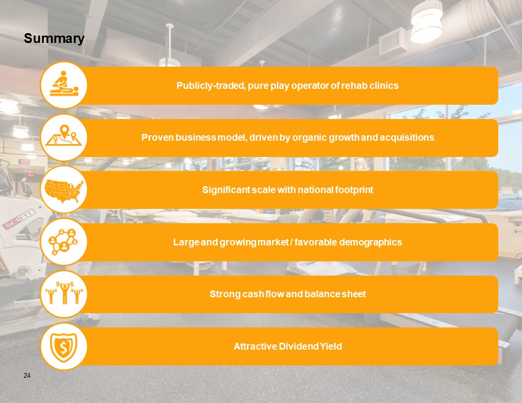 Summary  Significant scale with national footprint  Large and growing market / favorable demographics  Proven business model, driven by organic growth and acquisitions  Strong cash flow and balance sheet  Publicly-traded, pure play operator of rehab clinics  Attractive Dividend Yield  23