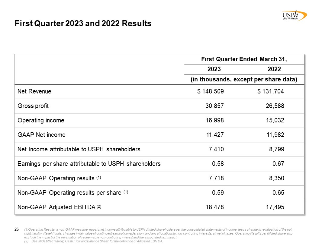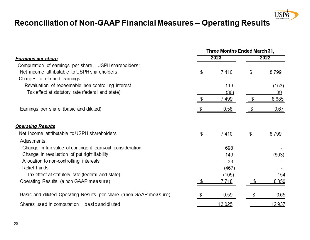 Reconciliation of Non-GAAP Financial Measures – Operating Results  Earnings per share  Computation of earnings per share - USPH shareholders:  Operating Results  Three Months Ended March 31, 2023 2022  Net income attributable to USPH shareholders  Charges to retained earnings:  $ 7,410  $ 8,799  Revaluation of redeemable non-controlling interest  119  (153)  Tax effect at statutory rate (federal and state)   (30)   39    $ 7,499    $ 8,685   Earnings per share (basic and diluted)   $ 0.58    $ 0.67   27  Net income attributable to USPH shareholders $ 7,410 $ 8,799  Adjustments:  Change in fair value of contingent earn-out consideration  698  -  Change in revaluation of put-right liability  149  (603)  Allocation to non-controlling interests  33  -  Relief Funds  (467)  -  Tax effect at statutory rate (federal and state)   (105)   154   Operating Results (a non-GAAP measure)   $ 7,718    $ 8,350   Basic and diluted Operating Results per share (a non-GAAP measure)   $ 0.59    $ 0.65   Shares used in computation - basic and diluted   13,025    12,937