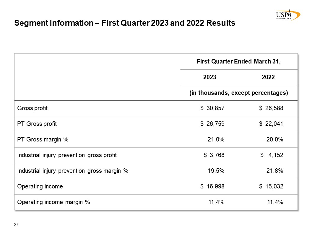 Segment Information – First Quarter 2023 and 2022 Results  First Quarter Ended March 31,  2023  2022  (in thousands, except percentages)  Gross profit  $ 30,857  $ 26,588  PT Gross profit  $ 26,759  $ 22,041  PT Gross margin %  21.0%  20.0%  Industrial injury prevention gross profit  $ 3,768  $ 4,152  Industrial injury prevention gross margin %  19.5%  21.8%  Operating income  $ 16,998  $ 15,032  Operating income margin %  11.4%  11.4%  27
