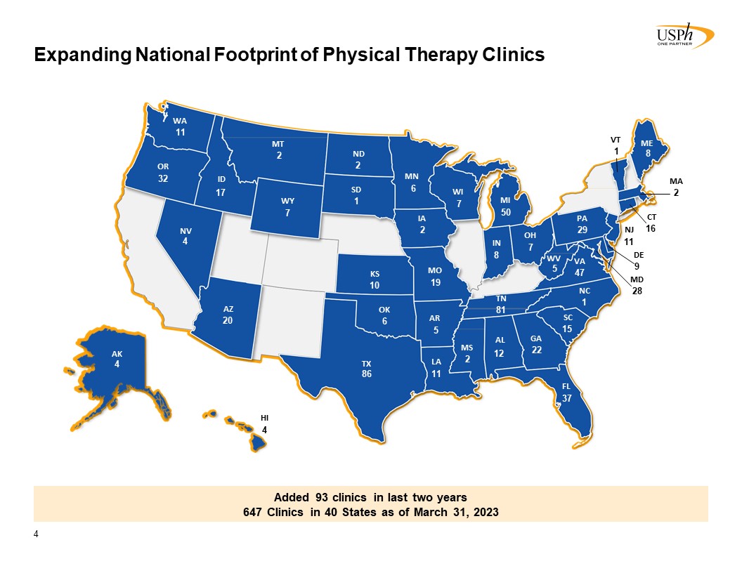 Expanding National Footprint of Physical Therapy Clinics  WA  11  OR  32  MT  2  ID  17  WY  7  NV  4  AK  4  AZ  20  ND  2  IA  2  WI  7  MN  6  SD  1  KS  10  MO  19  OK  6  TX  86  AR  5  LA  11  MS  2  AL  12  TN  81  OH  7  IN  8  MI  50  PA  29  WV  5  MA  2  CT  16  VA  47  NJ  11  DE 9 MD 28  NC  1  SC  15  GA  22  FL  37  ME  8  VT  1  HI  4  2  Added 93 clinics in last two years  647 Clinics in 40 States as of March 31, 2023