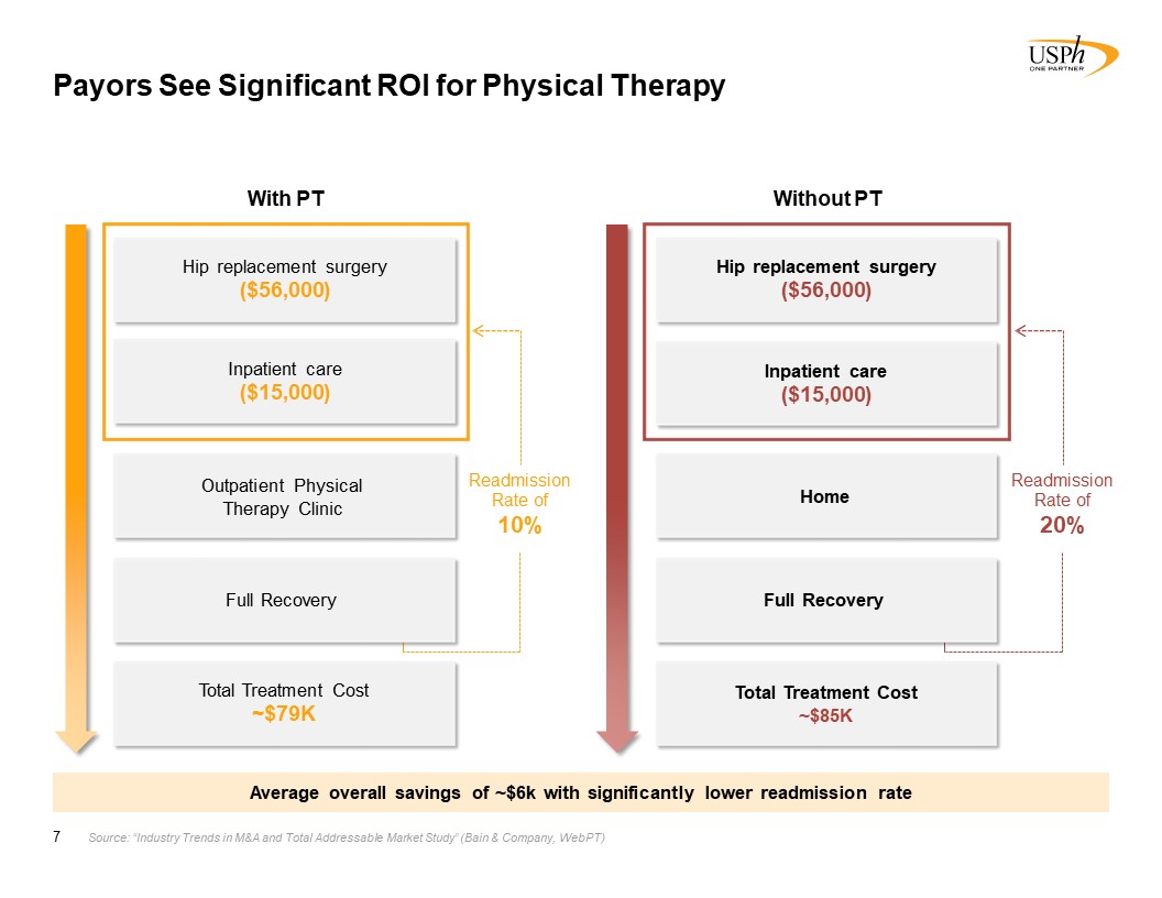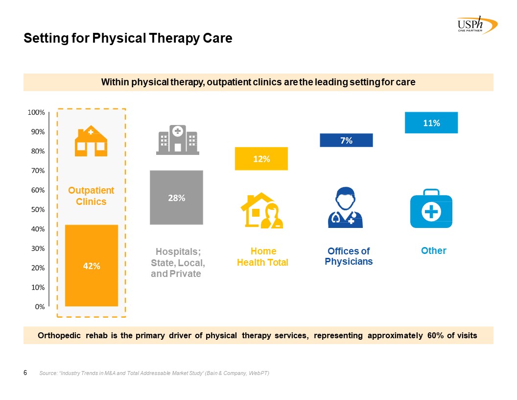 Setting for Physical Therapy Care  Orthopedic rehab is the primary driver of physical therapy services, representing approximately 60% of visits  Within physical therapy, outpatient clinics are the leading setting for care  Outpatient Clinics  5  Source: “Industry Trends in M&A and Total Addressable Market Study” (Bain & Company, WebPT)  Hospitals; State, Local, and Private  Home Health Total  Offices of Physicians  Other