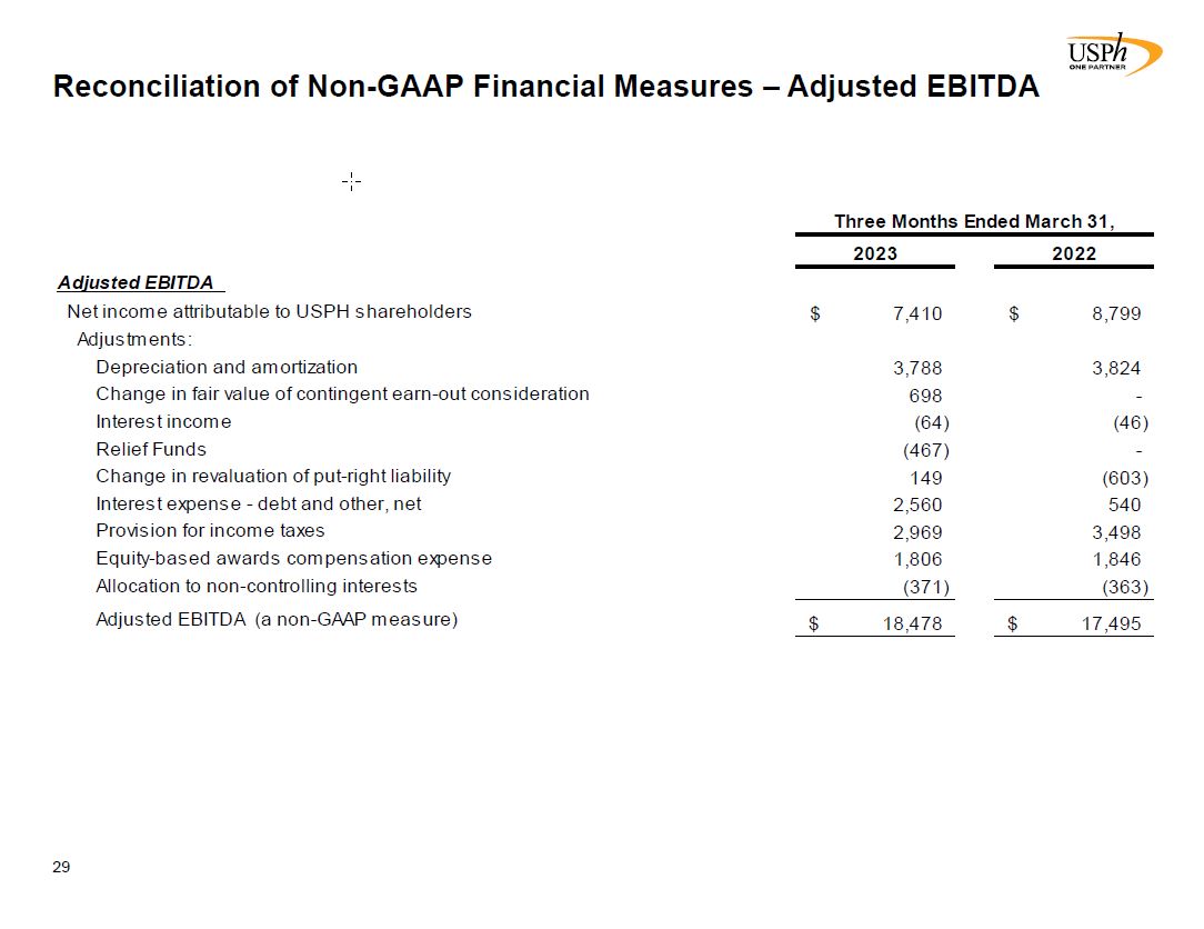 Reconciliation of Non-GAAP Financial Measures – Adjusted EBITDA  27  2023  2022  Adjusted EBITDA   Net income attributable to USPH shareholders  $  7,410  $  8,799  Adjustments:  Depreciation and amortization  3,788  3,824  Change in fair value of contingent earn-out consideration  698  -  Interest income  (64)  (46)  Relief Funds  (467)  -  Change in revaluation of put-right liability  149  (603)  Interest expense - debt and other, net  2,560  540  Provision for income taxes  2,969  3,498  Equity-based awards compensation expense  1,806  1,846  Allocation to non-controlling interests   (371)   (363)  Adjusted EBITDA (a non-GAAP measure)   $ 18,478    $ 17,495   Three Months Ended March 31,