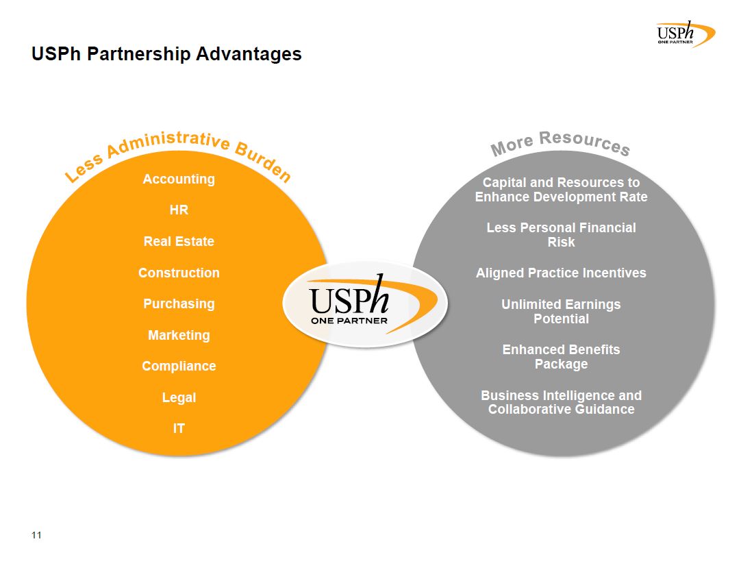 USPh Partnership Advantages  Accounting  HR  Real Estate  Construction  Purchasing  Marketing  Compliance  Legal  IT  Capital and Resources to Enhance Development Rate  Less Personal Financial Risk  Aligned Practice Incentives  Unlimited Earnings Potential  Enhanced Benefits Package  Business Intelligence and Collaborative Guidance  12