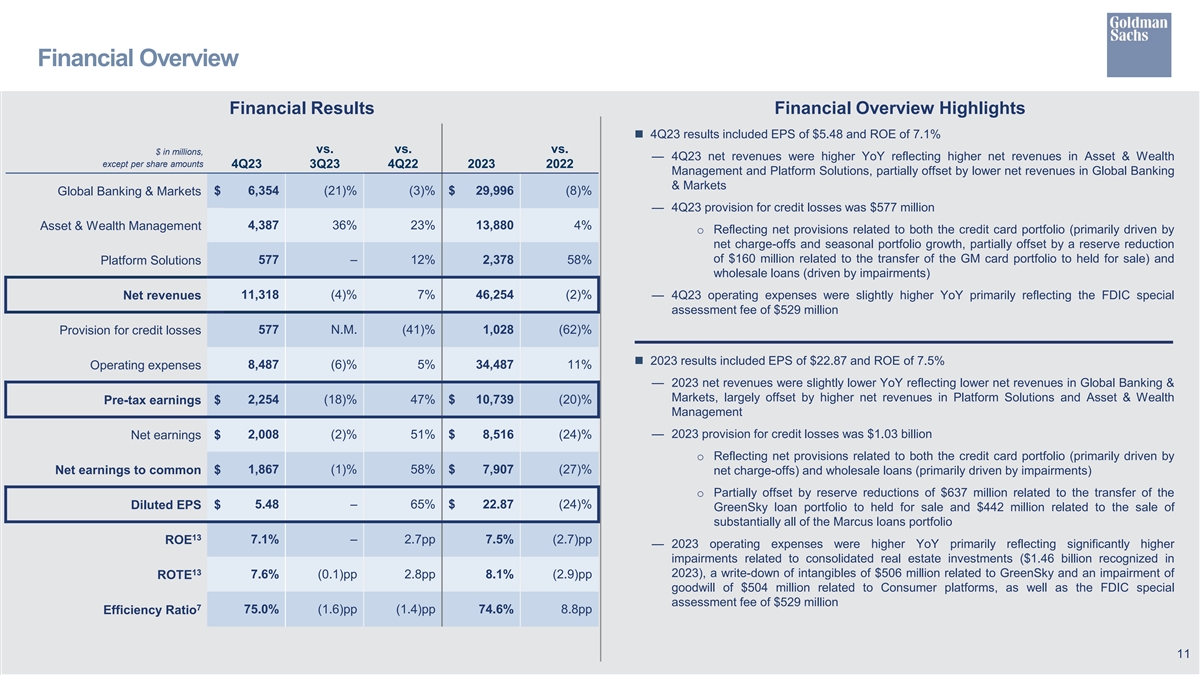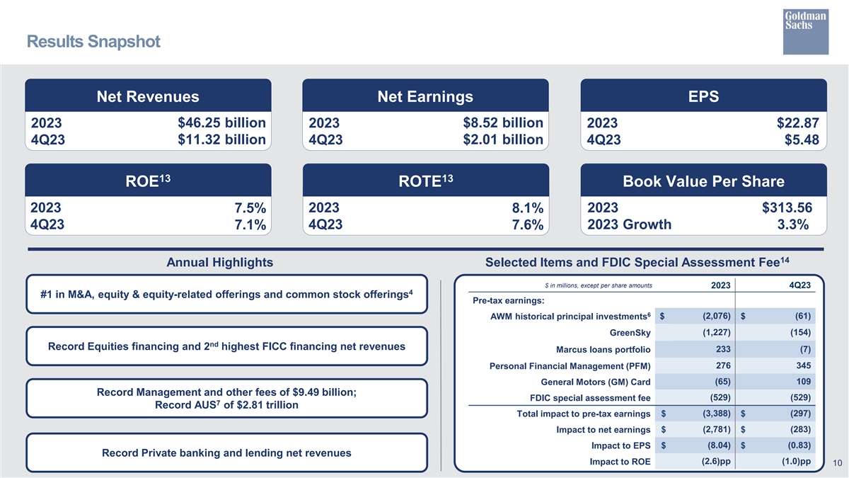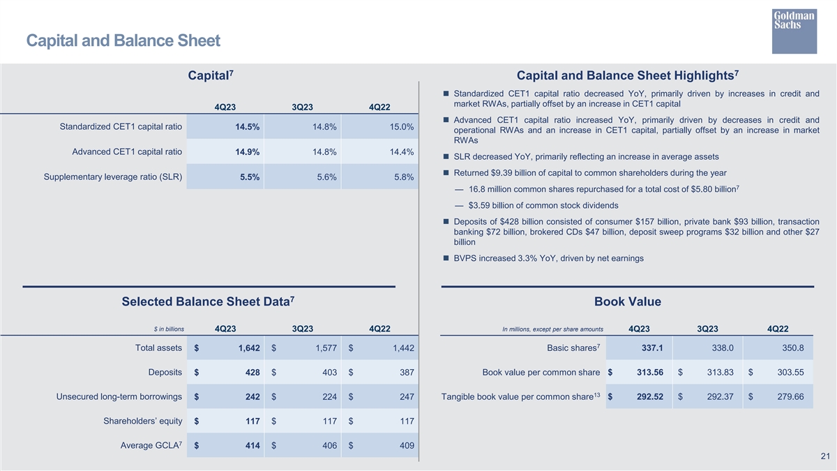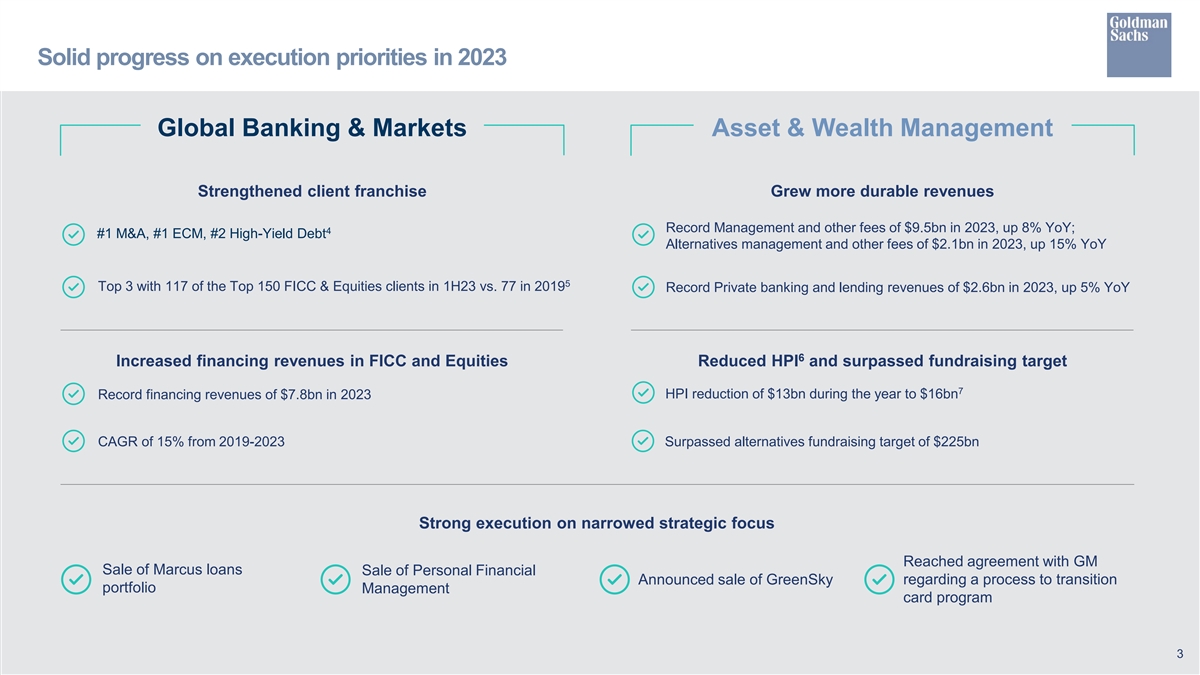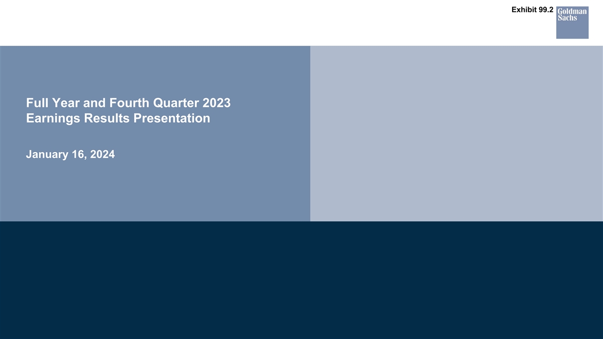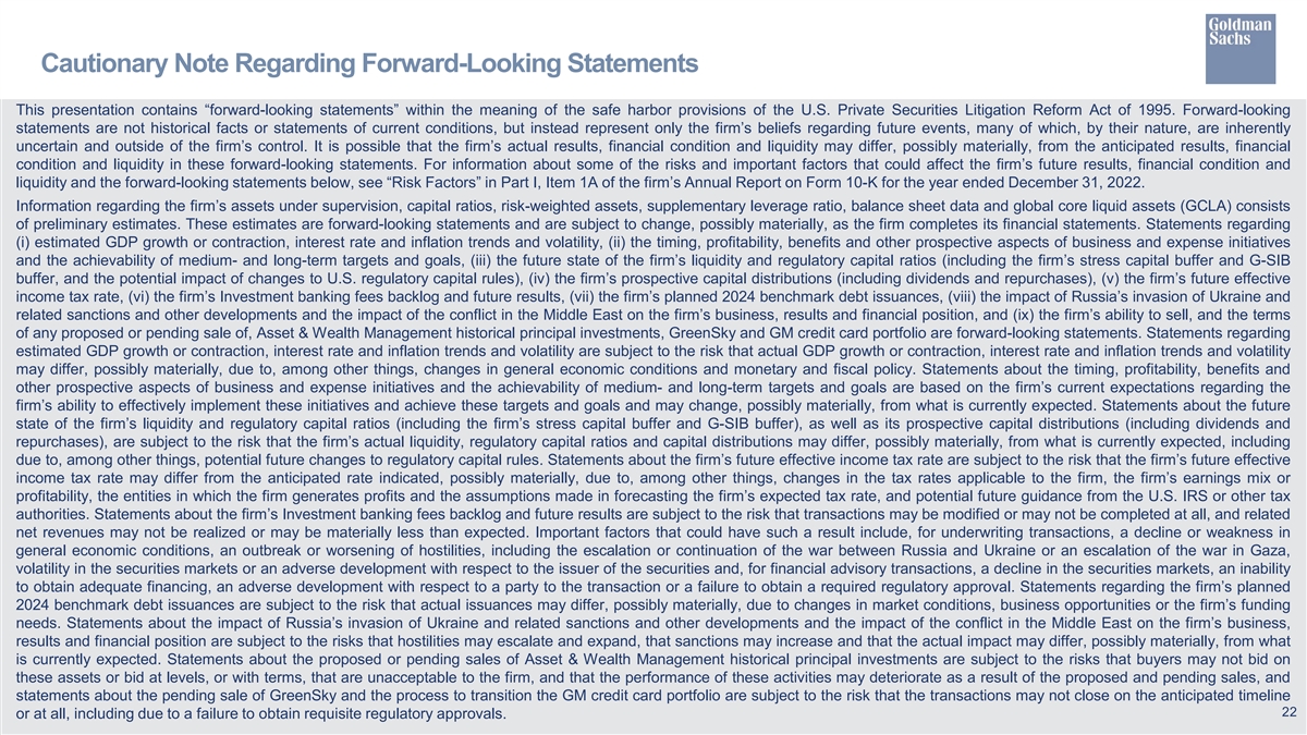 Cautionary Note Regarding Forward-Looking Statements This presentation contains “forward-looking statements” within the meaning of the safe harbor provisions of the U.S. Private Securities Litigation Reform Act of 1995. Forward-looking statements are not historical facts or statements of current conditions, but instead represent only the firm’s beliefs regarding future events, many of which, by their nature, are inherently uncertain and outside of the firm’s control. It is possible that the firm’s actual results, financial condition and liquidity may differ, possibly materially, from the anticipated results, financial condition and liquidity in these forward-looking statements. For information about some of the risks and important factors that could affect the firm’s future results, financial condition and liquidity and the forward-looking statements below, see “Risk Factors” in Part I, Item 1A of the firm’s Annual Report on Form 10-K for the year ended December 31, 2022. Information regarding the firm’s assets under supervision, capital ratios, risk-weighted assets, supplementary leverage ratio, balance sheet data and global core liquid assets (GCLA) consists of preliminary estimates. These estimates are forward-looking statements and are subject to change, possibly materially, as the firm completes its financial statements. Statements regarding (i) estimated GDP growth or contraction, interest rate and inflation trends and volatility, (ii) the timing, profitability, benefits and other prospective aspects of business and expense initiatives and the achievability of medium- and long-term targets and goals, (iii) the future state of the firm’s liquidity and regulatory capital ratios (including the firm’s stress capital buffer and G-SIB buffer, and the potential impact of changes to U.S. regulatory capital rules), (iv) the firm’s prospective capital distributions (including dividends and repurchases), (v) the firm’s future effective income tax rate, (vi) the firm’s Investment banking fees backlog and future results, (vii) the firm’s planned 2024 benchmark debt issuances, (viii) the impact of Russia’s invasion of Ukraine and related sanctions and other developments and the impact of the conflict in the Middle East on the firm’s business, results and financial position, and (ix) the firm’s ability to sell, and the terms of any proposed or pending sale of, Asset & Wealth Management historical principal investments, GreenSky and GM credit card portfolio are forward-looking statements. Statements regarding estimated GDP growth or contraction, interest rate and inflation trends and volatility are subject to the risk that actual GDP growth or contraction, interest rate and inflation trends and volatility may differ, possibly materially, due to, among other things, changes in general economic conditions and monetary and fiscal policy. Statements about the timing, profitability, benefits and other prospective aspects of business and expense initiatives and the achievability of medium- and long-term targets and goals are based on the firm’s current expectations regarding the firm’s ability to effectively implement these initiatives and achieve these targets and goals and may change, possibly materially, from what is currently expected. Statements about the future state of the firm’s liquidity and regulatory capital ratios (including the firm’s stress capital buffer and G-SIB buffer), as well as its prospective capital distributions (including dividends and repurchases), are subject to the risk that the firm’s actual liquidity, regulatory capital ratios and capital distributions may differ, possibly materially, from what is currently expected, including due to, among other things, potential future changes to regulatory capital rules. Statements about the firm’s future effective income tax rate are subject to the risk that the firm’s future effective income tax rate may differ from the anticipated rate indicated, possibly materially, due to, among other things, changes in the tax rates applicable to the firm, the firm’s earnings mix or profitability, the entities in which the firm generates profits and the assumptions made in forecasting the firm’s expected tax rate, and potential future guidance from the U.S. IRS or other tax authorities. Statements about the firm’s Investment banking fees backlog and future results are subject to the risk that transactions may be modified or may not be completed at all, and related net revenues may not be realized or may be materially less than expected. Important factors that could have such a result include, for underwriting transactions, a decline or weakness in general economic conditions, an outbreak or worsening of hostilities, including the escalation or continuation of the war between Russia and Ukraine or an escalation of the war in Gaza, volatility in the securities markets or an adverse development with respect to the issuer of the securities and, for financial advisory transactions, a decline in the securities markets, an inability to obtain adequate financing, an adverse development with respect to a party to the transaction or a failure to obtain a required regulatory approval. Statements regarding the firm’s planned 2024 benchmark debt issuances are subject to the risk that actual issuances may differ, possibly materially, due to changes in market conditions, business opportunities or the firm’s funding needs. Statements about the impact of Russia’s invasion of Ukraine and related sanctions and other developments and the impact of the conflict in the Middle East on the firm’s business, results and financial position are subject to the risks that hostilities may escalate and expand, that sanctions may increase and that the actual impact may differ, possibly materially, from what is currently expected. Statements about the proposed or pending sales of Asset & Wealth Management historical 