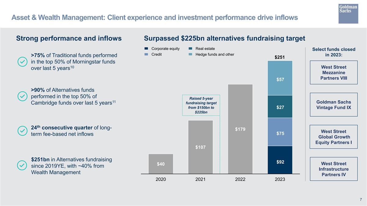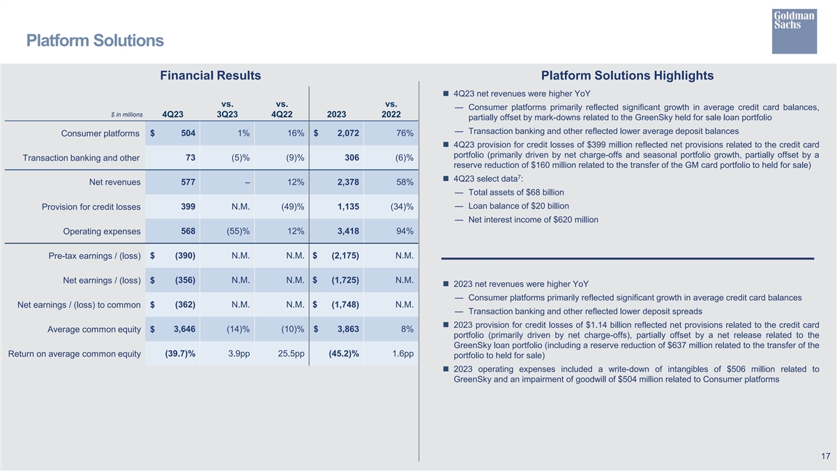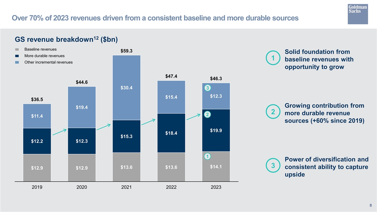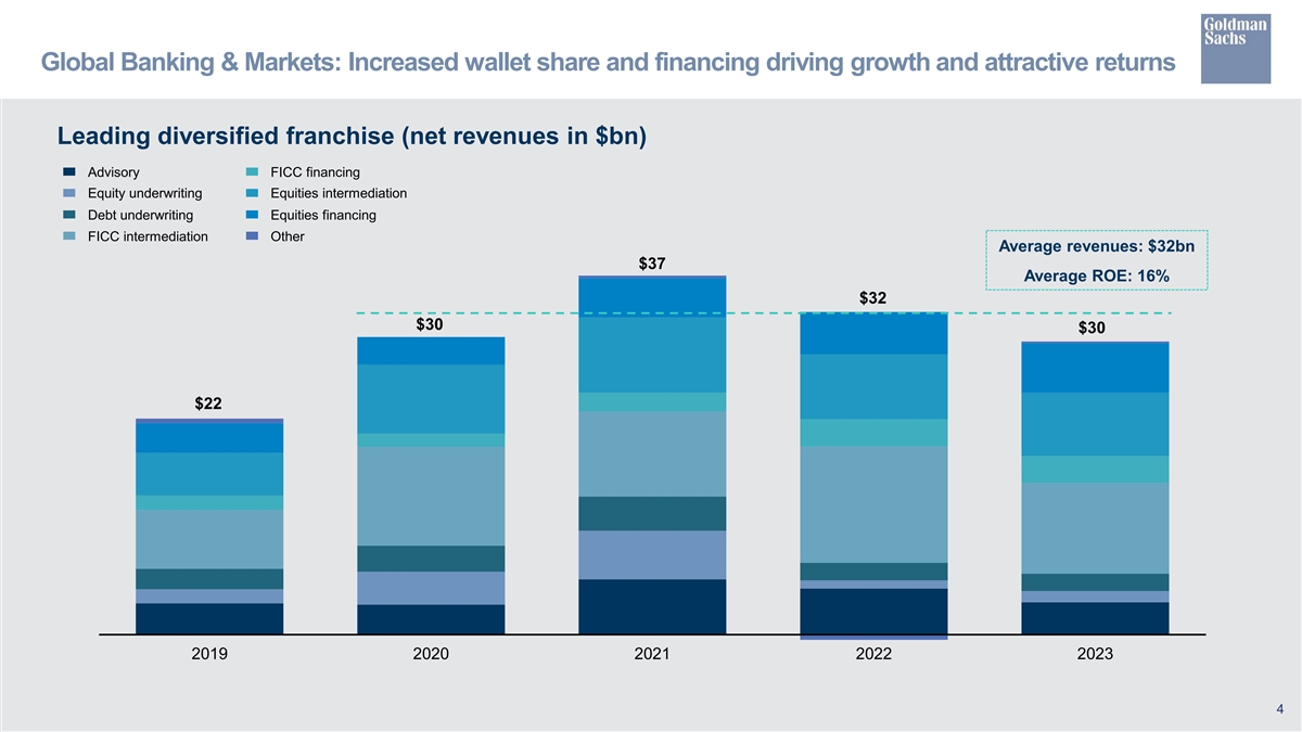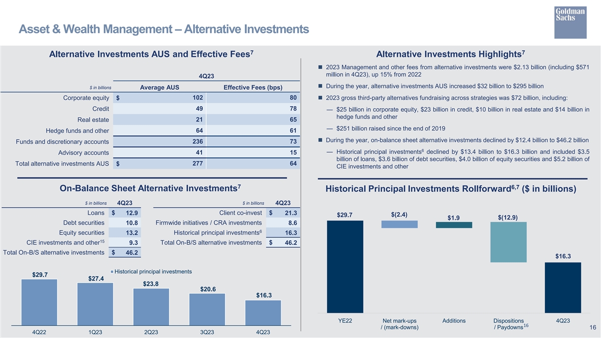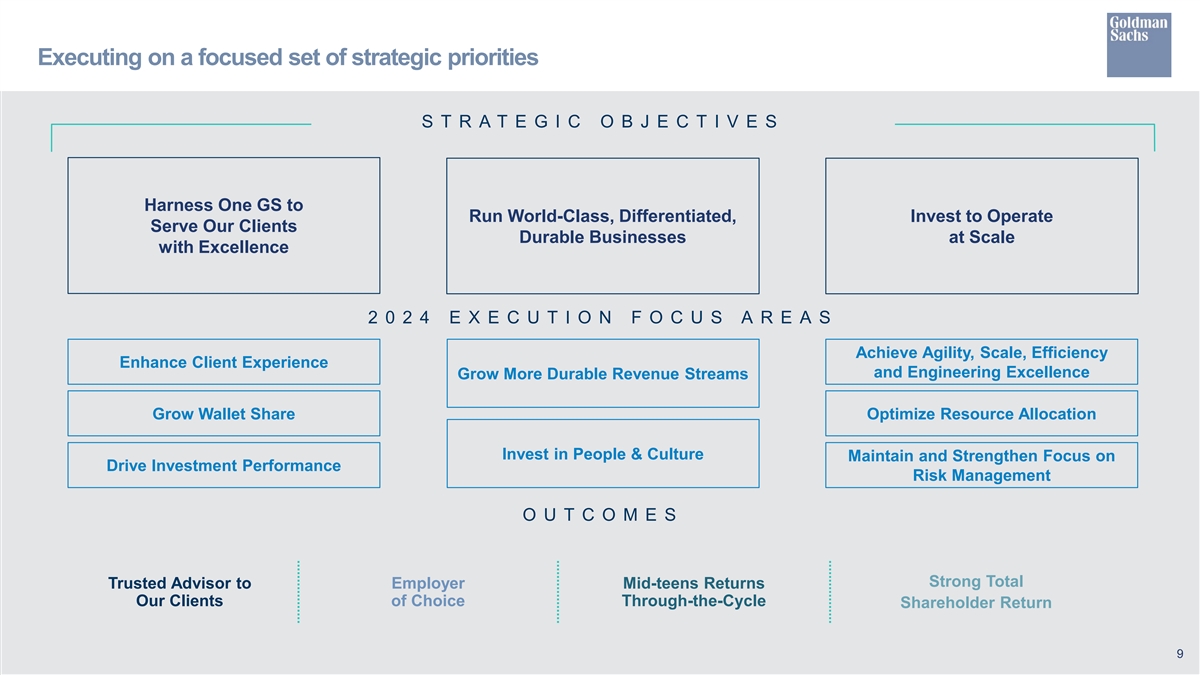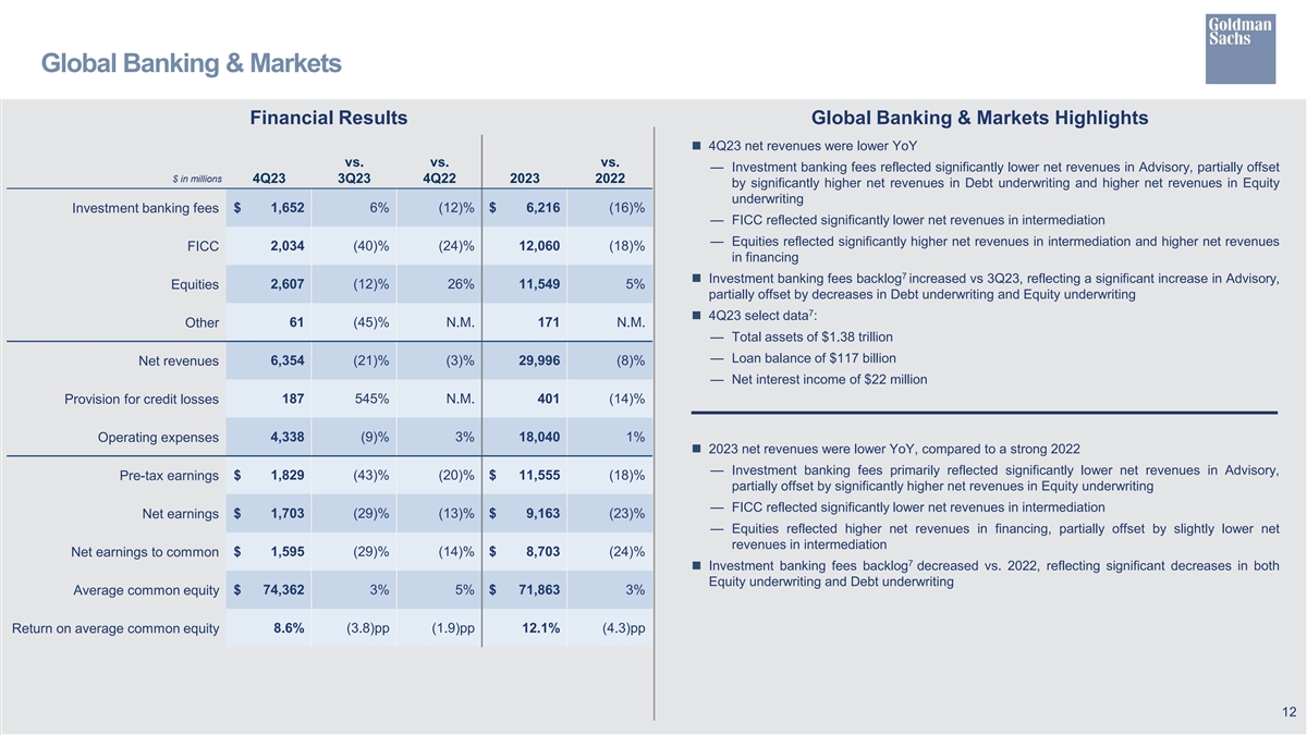 Cautionary Note Regarding Forward-Looking Statements This presentation contains “forward-looking statements” within the meaning of the safe harbor provisions of the U.S. Private Securities Litigation Reform Act of 1995. Forward-looking statements are not historical facts or statements of current conditions, but instead represent only the firm’s beliefs regarding future events, many of which, by their nature, are inherently uncertain and outside of the firm’s control. It is possible that the firm’s actual results, financial condition and liquidity may differ, possibly materially, from the anticipated results, financial condition and liquidity in these forward-looking statements. For information about some of the risks and important factors that could affect the firm’s future results, financial condition and liquidity and the forward-looking statements below, see “Risk Factors” in Part I, Item 1A of the firm’s Annual Report on Form 10-K for the year ended December 31, 2022. Information regarding the firm’s assets under supervision, capital ratios, risk-weighted assets, supplementary leverage ratio, balance sheet data and global core liquid assets (GCLA) consists of preliminary estimates. These estimates are forward-looking statements and are subject to change, possibly materially, as the firm completes its financial statements. Statements regarding (i) estimated GDP growth or contraction, interest rate and inflation trends and volatility, (ii) the timing, profitability, benefits and other prospective aspects of business and expense initiatives and the achievability of medium- and long-term targets and goals, (iii) the future state of the firm’s liquidity and regulatory capital ratios (including the firm’s stress capital buffer and G-SIB buffer, and the potential impact of changes to U.S. regulatory capital rules), (iv) the firm’s prospective capital distributions (including dividends and repurchases), (v) the firm’s future effective income tax rate, (vi) the firm’s Investment banking fees backlog and future results, (vii) the firm’s planned 2024 benchmark debt issuances, (viii) the impact of Russia’s invasion of Ukraine and related sanctions and other developments and the impact of the conflict in the Middle East on the firm’s business, results and financial position, and (ix) the firm’s ability to sell, and the terms of any proposed or pending sale of, Asset & Wealth Management historical principal investments, GreenSky and GM credit card portfolio are forward-looking statements. Statements regarding estimated GDP growth or contraction, interest rate and inflation trends and volatility are subject to the risk that actual GDP growth or contraction, interest rate and inflation trends and volatility may differ, possibly materially, due to, among other things, changes in general economic conditions and monetary and fiscal policy. Statements about the timing, profitability, benefits and other prospective aspects of business and expense initiatives and the achievability of medium- and long-term targets and goals are based on the firm’s current expectations regarding the firm’s ability to effectively implement these initiatives and achieve these targets and goals and may change, possibly materially, from what is currently expected. Statements about the future state of the firm’s liquidity and regulatory capital ratios (including the firm’s stress capital buffer and G-SIB buffer), as well as its prospective capital distributions (including dividends and repurchases), are subject to the risk that the firm’s actual liquidity, regulatory capital ratios and capital distributions may differ, possibly materially, from what is currently expected, including due to, among other things, potential future changes to regulatory capital rules. Statements about the firm’s future effective income tax rate are subject to the risk that the firm’s future effective income tax rate may differ from the anticipated rate indicated, possibly materially, due to, among other things, changes in the tax rates applicable to the firm, the firm’s earnings mix or profitability, the entities in which the firm generates profits and the assumptions made in forecasting the firm’s expected tax rate, and potential future guidance from the U.S. IRS or other tax authorities. Statements about the firm’s Investment banking fees backlog and future results are subject to the risk that transactions may be modified or may not be completed at all, and related net revenues may not be realized or may be materially less than expected. Important factors that could have such a result include, for underwriting transactions, a decline or weakness in general economic conditions, an outbreak or worsening of hostilities, including the escalation or continuation of the war between Russia and Ukraine or an escalation of the war in Gaza, volatility in the securities markets or an adverse development with respect to the issuer of the securities and, for financial advisory transactions, a decline in the securities markets, an inability to obtain adequate financing, an adverse development with respect to a party to the transaction or a failure to obtain a required regulatory approval. Statements regarding the firm’s planned 2024 benchmark debt issuances are subject to the risk that actual issuances may differ, possibly materially, due to changes in market conditions, business opportunities or the firm’s funding needs. Statements about the impact of Russia’s invasion of Ukraine and related sanctions and other developments and the impact of the conflict in the Middle East on the firm’s business, results and financial position are subject to the risks that hostilities may escalate and expand, that sanctions may increase and that the actual impact may differ, possibly materially, from what is currently expected. Statements about the proposed or pending sales of Asset & Wealth Management historical 