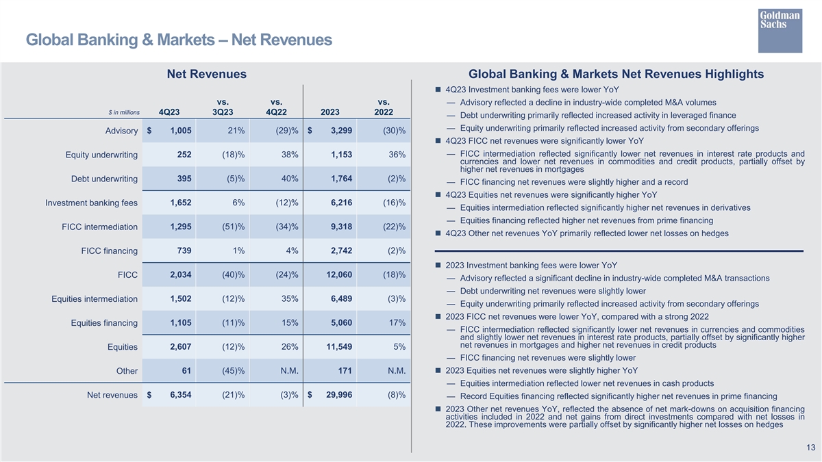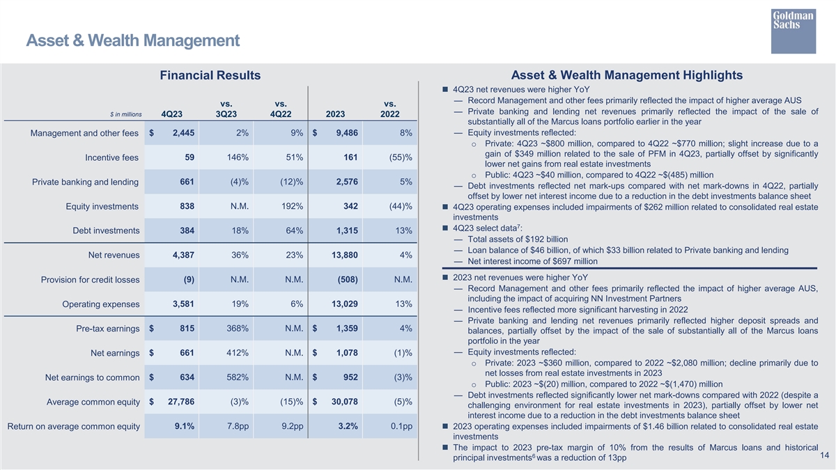 Global Banking & Markets – Net Revenues Net Revenues Global Banking & Markets Net Revenues Highlights n 4Q23 Investment banking fees were lower YoY vs. vs. vs. — Advisory reflected a decline in industry-wide completed M&A volumes $ in millions 4Q23 3Q23 4Q22 2023 2022 — Debt underwriting primarily reflected increased activity in leveraged finance — Equity underwriting primarily reflected increased activity from secondary offerings Advisory $ 1,005 21% (29)% $ 3,299 (30)% n 4Q23 FICC net revenues were significantly lower YoY — FICC intermediation reflected significantly lower net revenues in interest rate products and Equity underwriting 252 (18)% 38% 1,153 36% currencies and lower net revenues in commodities and credit products, partially offset by higher net revenues in mortgages 395 (5)% 40% 1,764 (2)% Debt underwriting — FICC financing net revenues were slightly higher and a record n 4Q23 Equities net revenues were significantly higher YoY 1,652 6% (12)% 6,216 (16)% Investment banking fees — Equities intermediation reflected significantly higher net revenues in derivatives — Equities financing reflected higher net revenues from prime financing 1,295 (51)% (34)% 9,318 (22)% FICC intermediation n 4Q23 Other net revenues YoY primarily reflected lower net losses on hedges 739 1% 4% 2,742 (2)% FICC financing n 2023 Investment banking fees were lower YoY FICC 2,034 (40)% (24)% 12,060 (18)% — Advisory reflected a significant decline in industry-wide completed M&A transactions — Debt underwriting net revenues were slightly lower Equities intermediation 1,502 (12)% 35% 6,489 (3)% — Equity underwriting primarily reflected increased activity from secondary offerings n 2023 FICC net revenues were lower YoY, compared with a strong 2022 Equities financing 1,105 (11)% 15% 5,060 17% — FICC intermediation reflected significantly lower net revenues in currencies and commodities and slightly lower net revenues in interest rate products, partially offset by significantly higher net revenues in mortgages and higher net revenues in credit products Equities 2,607 (12)% 26% 11,549 5% — FICC financing net revenues were slightly lower Other 61 (45)% N.M. 171 N.M.n 2023 Equities net revenues were slightly higher YoY — Equities intermediation reflected lower net revenues in cash products Net revenues $ 6,354 (21)% (3)% $ 29,996 (8)% — Record Equities financing reflected significantly higher net revenues in prime financing n 2023 Other net revenues YoY, reflected the absence of net mark-downs on acquisition financing activities included in 2022 and net gains from direct investments compared with net losses in 2022. These improvements were partially offset by significantly higher net losses on hedges 13
