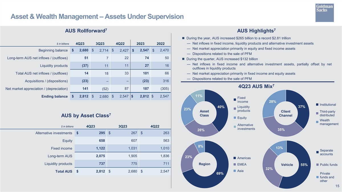 Results Snapshot Net Revenues Net Earnings EPS 2023 $46.25 billion 2023 $8.52 billion 2023 $22.87 4Q23 $11.32 billion 4Q23 $2.01 billion 4Q23 $5.48 13 13 ROE ROTE Book Value Per Share 2023 7.5% 2023 8.1% 2023 $313.56 4Q23 7.1% 4Q23 7.6% 2023 Growth 3.3% 14 Annual Highlights Selected Items and FDIC Special Assessment Fee $ in millions, except per share amounts 2023 4Q23 4 #1 in M&A, equity & equity-related offerings and common stock offerings Pre-tax earnings: 6 (2,076) (61) AWM historical principal investments $ $ GreenSky (1,227) (154) nd Record Equities financing and 2 highest FICC financing net revenues Marcus loans portfolio 233 (7) Personal Financial Management (PFM) 276 345 General Motors (GM) Card (65) 109 Record Management and other fees of $9.49 billion; FDIC special assessment fee (529) (529) 7 Record AUS of $2.81 trillion Total impact to pre-tax earnings $ (3,388) $ (297) (2,781) (283) Impact to net earnings $ $ (8.04) (0.83) Impact to EPS $ $ Record Private banking and lending net revenues (2.6)pp (1.0)pp Impact to ROE 10