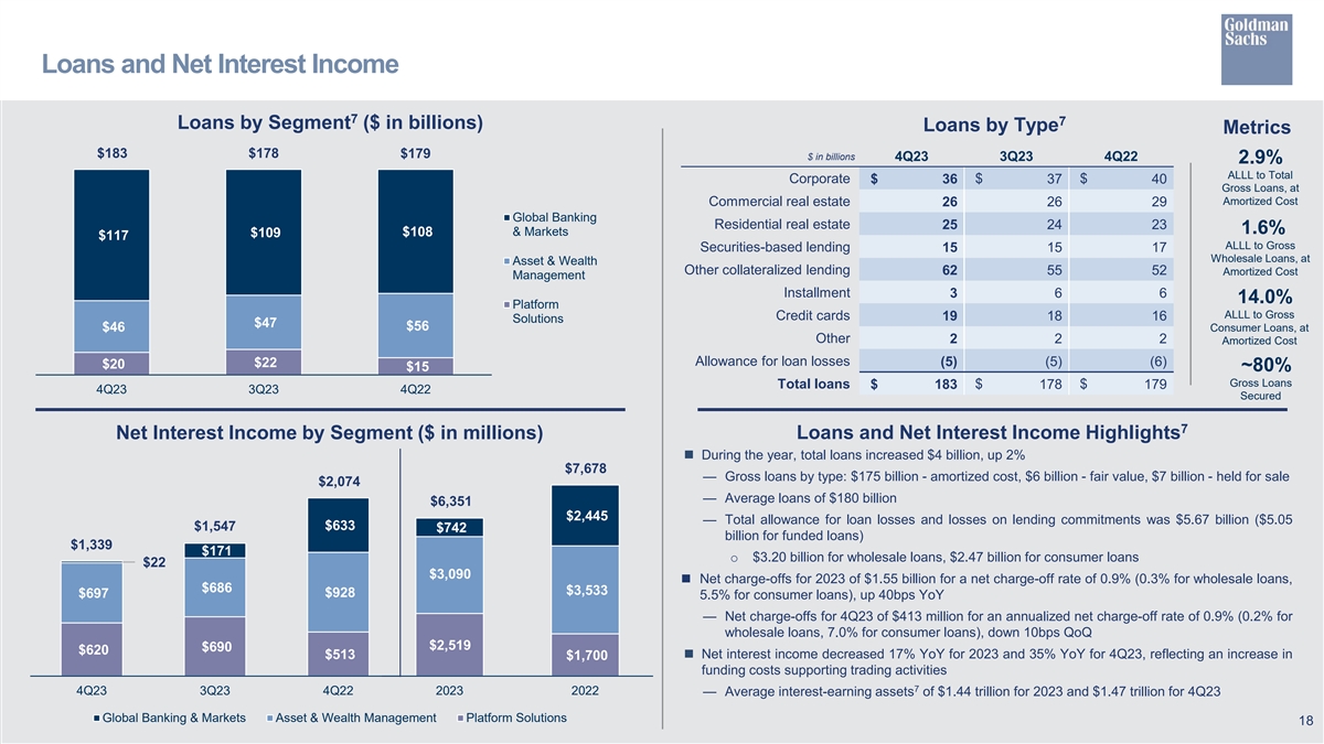 Loans and Net Interest Income 7 7 Loans by Segment ($ in billions) Loans by Type Metrics $183 $178 $179 $ in billions 4Q23 3Q23 4Q22 2.9% ALLL to Total Corporate $ 36 $ 37 $ 40 Gross Loans, at Amortized Cost Commercial real estate 26 26 29 Global Banking Residential real estate 25 24 23 1.6% & Markets $109 $108 $117 ALLL to Gross Securities-based lending 15 15 17 Wholesale Loans, at Asset & Wealth Other collateralized lending 62 55 52 Amortized Cost Management Installment 3 6 6 14.0% Platform ALLL to Gross Credit cards 19 18 16 Solutions $47 $56 $46 Consumer Loans, at Other 2 2 2 Amortized Cost Allowance for loan losses (5) (5) (6) $22 $20 $15 ~80% Gross Loans Total loans $ 183 $ 178 $ 179 4Q23 3Q23 4Q22 Secured 7 Net Interest Income by Segment ($ in millions) Loans and Net Interest Income Highlights n During the year, total loans increased $4 billion, up 2% $7,678 — Gross loans by type: $175 billion - amortized cost, $6 billion - fair value, $7 billion - held for sale $2,074 — Average loans of $180 billion $6,351 $2,445 — Total allowance for loan losses and losses on lending commitments was $5.67 billion ($5.05 $1,547 $633 $742 billion for funded loans) $1,339 $171 o $3.20 billion for wholesale loans, $2.47 billion for consumer loans $22 $3,090 n Net charge-offs for 2023 of $1.55 billion for a net charge-off rate of 0.9% (0.3% for wholesale loans, $686 $3,533 $697 $928 5.5% for consumer loans), up 40bps YoY — Net charge-offs for 4Q23 of $413 million for an annualized net charge-off rate of 0.9% (0.2% for wholesale loans, 7.0% for consumer loans), down 10bps QoQ $2,519 $690 $620 n Net interest income decreased 17% YoY for 2023 and 35% YoY for 4Q23, reflecting an increase in $513 $1,700 funding costs supporting trading activities 7 4Q23 3Q23 4Q22 2023 2022 — Average interest-earning assets of $1.44 trillion for 2023 and $1.47 trillion for 4Q23 Global Banking & Markets Asset & Wealth Management Platform Solutions 18