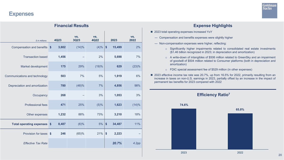 Expenses Financial Results Expense Highlights n 2023 total operating expenses increased YoY vs. vs. vs. — Compensation and benefits expenses were slightly higher 4Q23 3Q23 4Q22 2023 2022 $ in millions — Non-compensation expenses were higher, reflecting: Compensation and benefits $ 3,602 (14)% (4)% $ 15,499 2% o Significantly higher impairments related to consolidated real estate investments ($1.46 billion recognized in 2023; in depreciation and amortization) Transaction based 1,456 – 2% 5,698 7% o A write-down of intangibles of $506 million related to GreenSky and an impairment of goodwill of $504 million related to Consumer platforms (both in depreciation and amortization) 175 29% (19)% 629 (23)% Market development o FDIC special assessment fee of $529 million (in other expenses) n 2023 effective income tax rate was 20.7%, up from 16.5% for 2022, primarily resulting from an Communications and technology 503 7% 5% 1,919 6% increase in taxes on non-U.S. earnings in 2023, partially offset by an increase in the impact of permanent tax benefits for 2023 compared with 2022 780 (48)% 7% 4,856 98% Depreciation and amortization 7 Occupancy 268 – 3% 1,053 3% Efficiency Ratio Professional fees 471 25% (5)% 1,623 (14)% 74.6% 65.8% 1,232 88% 73% 3,210 18% Other expenses Total operating expenses $ 8,487 (6)% 5% $ 34,487 11% 246 (65)% 21% $ 2,223 – Provision for taxes $ Effective Tax Rate 20.7% 4.2pp 2023 2022 20