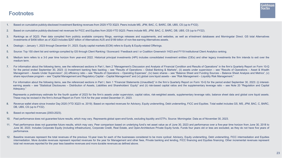 Footnotes 1. Based on cumulative publicly-disclosed Investment Banking revenues from 2020-YTD 3Q23. Peers include MS, JPM, BAC, C, BARC, DB, UBS, CS (up to FY22). 2. Based on cumulative publicly-disclosed net revenues for FICC and Equities from 2020-YTD 3Q23. Peers include MS, JPM, BAC, C, BARC, DB, UBS, CS (up to FY22). 3. Rankings as of 3Q23. Peer data compiled from publicly available company filings, earnings releases and supplements, and websites, as well as eVestment databases and Morningstar Direct. GS total Alternatives investments of $456 billion as of 3Q23 includes $267 billion of Alternatives AUS and $189 billion of non-fee-earning Alternatives assets. 4. Dealogic – January 1, 2023 through December 31, 2023. Equity capital markets (ECM) refers to Equity & Equity-related Offerings. 5. Source: Top 150 client list and rankings compiled by GS through Client Ranking / Scorecard / Feedback and / or Coalition Greenwich 1H23 and FY19 Institutional Client Analytics ranking. 6. Medium term refers to a 3-5 year time horizon from year-end 2022. Historical principal investments (HPI) includes consolidated investment entities (CIEs) and other legacy investments the firm intends to exit over the medium term. 7. For information about the following items, see the referenced sections in Part I, Item 2 “Management’s Discussion and Analysis of Financial Condition and Results of Operations” in the firm’s Quarterly Report on Form 10-Q for the period ended September 30, 2023: (i) Investment banking fees backlog – see “Results of Operations – Global Banking & Markets”, (ii) assets under supervision – see “Results of Operations – Asset & Wealth Management – Assets Under Supervision”, (iii) efficiency ratio – see “Results of Operations – Operating Expenses”, (iv) basic shares – see “Balance Sheet and Funding Sources – Balance Sheet Analysis and Metrics”, (v) share repurchase program – see “Capital Management and Regulatory Capital – Capital Management” and (vi) global core liquid assets – see “Risk Management – Liquidity Risk Management.” For information about the following items, see the referenced sections in Part I, Item 1 “Financial Statements (Unaudited)” in the firm’s Quarterly Report on Form 10-Q for the period ended September 30, 2023: (i) interest- earning assets – see “Statistical Disclosures – Distribution of Assets, Liabilities and Shareholders’ Equity” and (ii) risk-based capital ratios and the supplementary leverage ratio – see Note 20 “Regulation and Capital Adequacy.” Represents a preliminary estimate for the fourth quarter of 2023 for the firm’s assets under supervision, capital ratios, risk-weighted assets, supplementary leverage ratio, balance sheet data and global core liquid assets. These may be revised in the firm’s Annual Report on Form 10-K for the year ended December 31, 2023. 8. Revenue wallet share since Investor Day 2020 (YTD 3Q23 vs. 2019). Based on reported revenues for Advisory, Equity underwriting, Debt underwriting, FICC and Equities. Total wallet includes GS, MS, JPM, BAC, C, BARC, DB, UBS, CS (up to FY22). 9. Based on reported revenues (2003-2023). 10. Past performance does not guarantee future results, which may vary. Represents global open-end funds, excluding liquidity and ETFs. Source: Morningstar. Data as of November 30, 2023. 11. Past performance does not guarantee future results, which may vary. Peer comparison based on underlying fund’s net asset value as of June 30, 2023 and performance over a five-year time horizon from June 30, 2018 to June 30, 2023. Includes Corporate Equity (including infrastructure), Corporate Credit, Real Estate, and Open-Architecture Private Equity funds. Funds four years old or less are excluded, as they do not have five years of performance. 12. Baseline revenues represent the total revenues of the previous 10-year lows for each of the businesses considered to be more cyclical: Advisory, Equity underwriting, Debt underwriting, FICC intermediation and Equities intermediation. More durable revenues represent reported revenues for the year for Management and other fees, Private banking and lending, FICC financing and Equities financing. Other incremental revenues represent total net revenues reported for the year less baseline revenues and more durable revenues as defined above. 23