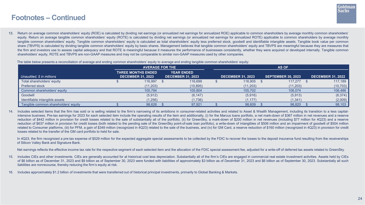 Footnotes – Continued 13. Return on average common shareholders’ equity (ROE) is calculated by dividing net earnings (or annualized net earnings for annualized ROE) applicable to common shareholders by average monthly common shareholders’ equity. Return on average tangible common shareholders’ equity (ROTE) is calculated by dividing net earnings (or annualized net earnings for annualized ROTE) applicable to common shareholders by average monthly tangible common shareholders’ equity. Tangible common shareholders’ equity is calculated as total shareholders’ equity less preferred stock, goodwill and identifiable intangible assets. Tangible book value per common share (TBVPS) is calculated by dividing tangible common shareholders’ equity by basic shares. Management believes that tangible common shareholders’ equity and TBVPS are meaningful because they are measures that the firm and investors use to assess capital adequacy and that ROTE is meaningful because it measures the performance of businesses consistently, whether they were acquired or developed internally. Tangible common shareholders’ equity, ROTE and TBVPS are non-GAAP measures and may not be comparable to similar non-GAAP measures used by other companies. The table below presents a reconciliation of average and ending common shareholders’ equity to average and ending tangible common shareholders’ equity: AVERAGE FOR THE AS OF THREE MONTHS ENDED YEAR ENDED Unaudited, $ in millions DECEMBER 31, 2023 DECEMBER 31, 2023 DECEMBER 31, 2023 SEPTEMBER 30, 2023 DECEMBER 31, 2022 Total shareholders’ equity $ 116,997 $ 116,699 $ 116,905 $ 117,277 $ 117,189 Preferred stock (11,203) (10,895) (11,203) (11,203) (10,703) Common shareholders’ equity 105,794 105,804 105,702 106,074 106,486 Goodwill (5,912) (6,147) (5,916) (5,913) (6,374) Identifiable intangible assets (1,256) (1,736) (1,177) (1,341) (2,009) Tangible common shareholders’ equity $ 98,626 $ 97,921 $ 98,609 $ 98,820 $ 98,103 14. Includes selected items that the firm has sold or is selling related to the firm’s narrowing of its ambitions in consumer-related activities and related to Asset & Wealth Management, including its transition to a less capital- intensive business. Pre-tax earnings for 2023 for each selected item include the operating results of the item and additionally, (i) for the Marcus loans portfolio, a net mark-down of $367 million in net revenues and a reserve reduction of $442 million in provision for credit losses related to the sale of substantially all of the portfolio, (ii) for GreenSky, a mark-down of $200 million in net revenues (including $77 million for 4Q23) and a reserve reduction of $637 million in provision for credit losses (both related to the pending sale of the GreenSky point-of-sale loan portfolio), a write-down of intangibles of $506 million and an impairment of goodwill of $504 million related to Consumer platforms, (iii) for PFM, a gain of $349 million (recognized in 4Q23) related to the sale of the business, and (iv) for GM Card, a reserve reduction of $160 million (recognized in 4Q23) in provision for credit losses related to the transfer of the GM card portfolio to held for sale. In 4Q23, the firm recognized a pre-tax expense of $529 million for the expected aggregate special assessments to be collected by the FDIC to recover the losses to the deposit insurance fund resulting from the receiverships of Silicon Valley Bank and Signature Bank. Net earnings reflects the effective income tax rate for the respective segment of each selected item and the allocation of the FDIC special assessment fee, adjusted for a write-off of deferred tax assets related to GreenSky. 15. Includes CIEs and other investments. CIEs are generally accounted for at historical cost less depreciation. Substantially all of the firm’s CIEs are engaged in commercial real estate investment activities. Assets held by CIEs of $6 billion as of December 31, 2023 and $9 billion as of September 30, 2023 were funded with liabilities of approximately $3 billion as of December 31, 2023 and $6 billion as of September 30, 2023. Substantially all such liabilities are nonrecourse, thereby reducing the firm’s equity at risk. 16. Includes approximately $1.2 billion of investments that were transferred out of historical principal investments, primarily to Global Banking & Markets. 24