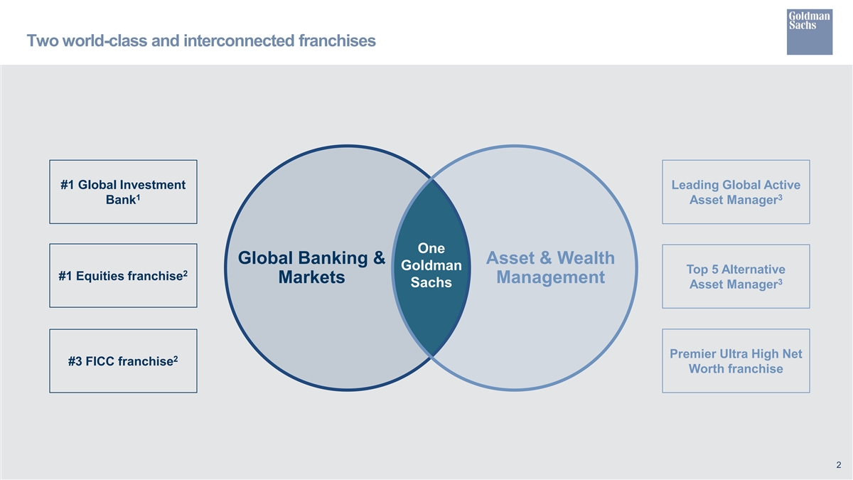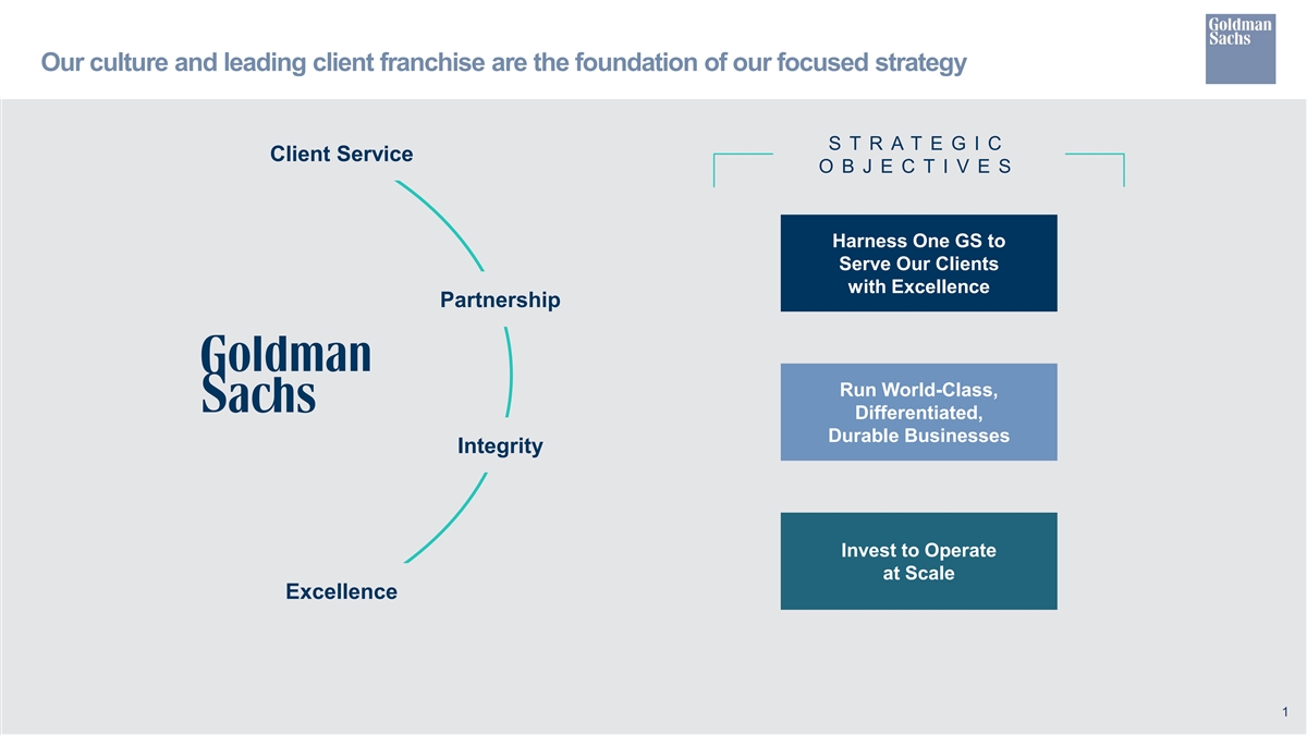 Our culture and leading client franchise are the foundation of our focused strategy S TRA TE G I C Client Service OBJ EC T I VES Harness One GS to Serve Our Clients with Excellence Partnership Run World-Class, Differentiated, Durable Businesses Integrity Invest to Operate at Scale Excellence 1