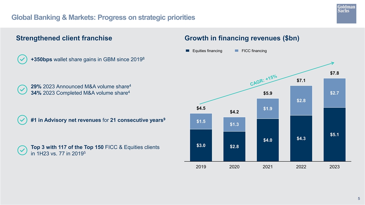 Global Banking & Markets: Increased wallet share and financing driving growth and attractive returns Leading diversified franchise (net revenues in $bn) Advisory FICC financing Equity underwriting Equities intermediation Debt underwriting Equities financing FICC intermediation Other Average revenues: $32bn $37 Average ROE: 16% $32 $30 $30 $22 2019 2020 2021 2022 2023 4