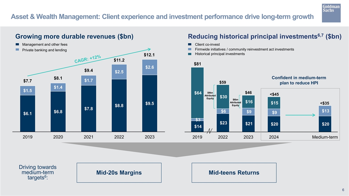 Asset & Wealth Management: Client experience and investment performance drive long-term growth 6,7 Growing more durable revenues ($bn) Reducing historical principal investments ($bn) Management and other fees Client co-invest Firmwide initiatives / community reinvestment act investments Private banking and lending Historical principal investments $12.1 $11.2 $81 $2.6 $9.4 $2.5 Confident in medium-term $8.1 $1.7 $7.7 $59 plan to reduce HPI $1.4 $1.5 $9bn $46 $64 <$45 Attributed $30 Equity $6bn Attributed $16 $15 <$35 $9.5 Equity $8.8 $7.8 $13 $6 $6.8 $9 $9 $6.1 $3 $23 $21 $20 $20 $14 2019 2020 2021 2022 2023 2019 2022 2023 2024 Medium-term Driving towards medium-term Mid-20s Margins Mid-teens Returns 6 targets : 6