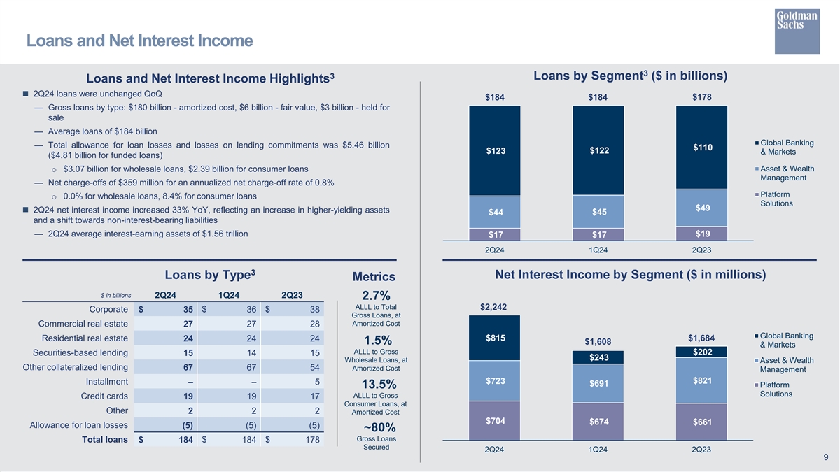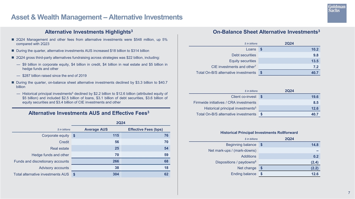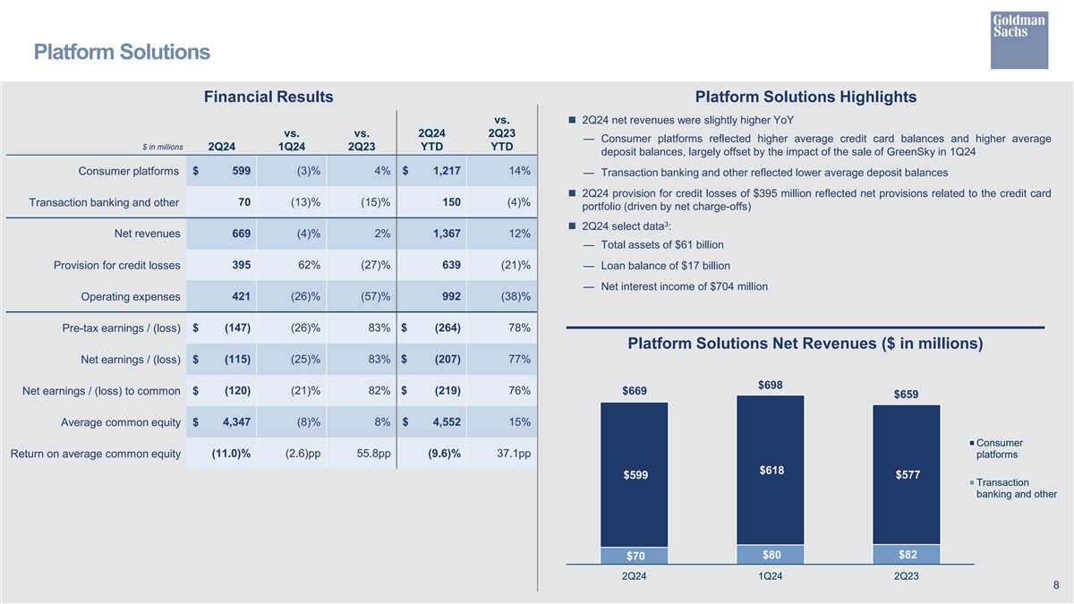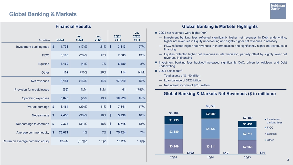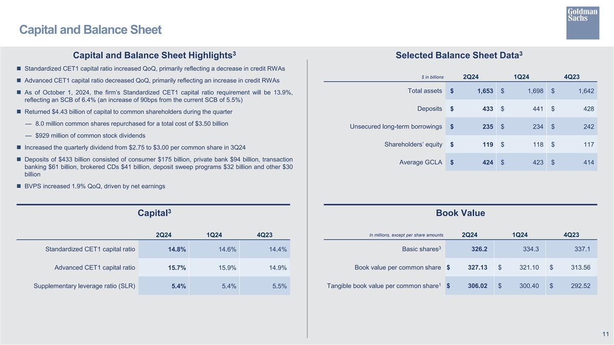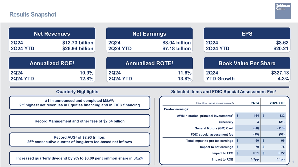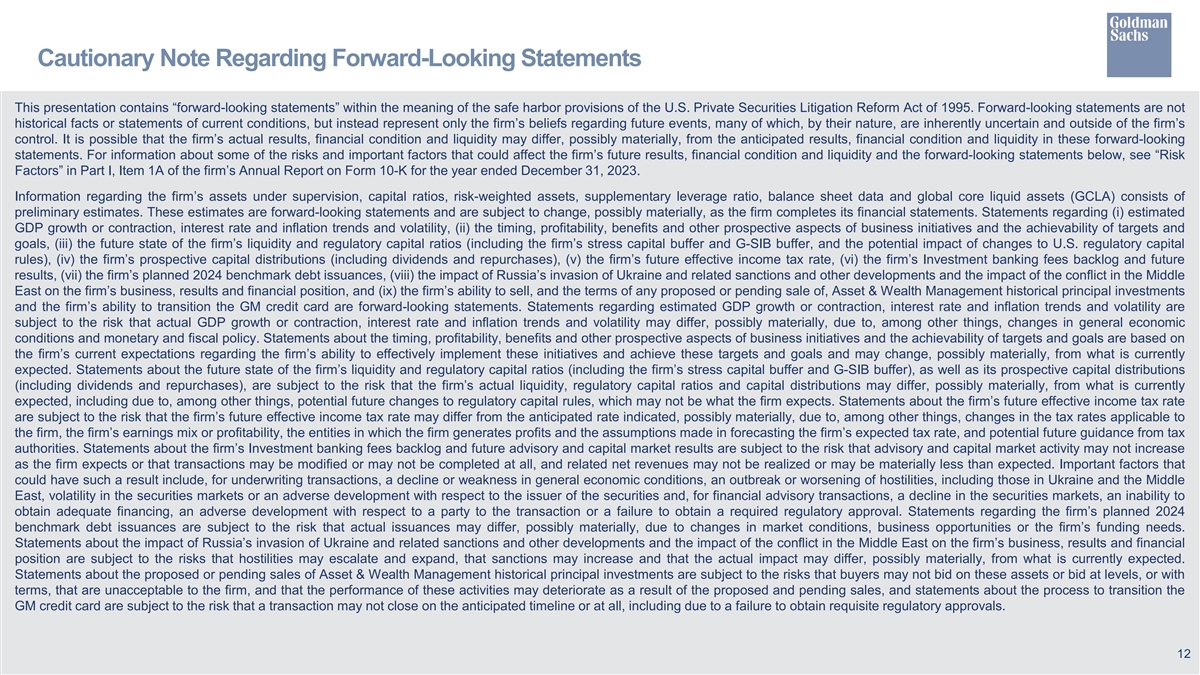 Cautionary Note Regarding Forward-Looking Statements This presentation contains “forward-looking statements” within the meaning of the safe harbor provisions of the U.S. Private Securities Litigation Reform Act of 1995. Forward-looking statements are not historical facts or statements of current conditions, but instead represent only the firm’s beliefs regarding future events, many of which, by their nature, are inherently uncertain and outside of the firm’s control. It is possible that the firm’s actual results, financial condition and liquidity may differ, possibly materially, from the anticipated results, financial condition and liquidity in these forward-looking statements. For information about some of the risks and important factors that could affect the firm’s future results, financial condition and liquidity and the forward-looking statements below, see “Risk Factors” in Part I, Item 1A of the firm’s Annual Report on Form 10-K for the year ended December 31, 2023. Information regarding the firm’s assets under supervision, capital ratios, risk-weighted assets, supplementary leverage ratio, balance sheet data and global core liquid assets (GCLA) consists of preliminary estimates. These estimates are forward-looking statements and are subject to change, possibly materially, as the firm completes its financial statements. Statements regarding (i) estimated GDP growth or contraction, interest rate and inflation trends and volatility, (ii) the timing, profitability, benefits and other prospective aspects of business initiatives and the achievability of targets and goals, (iii) the future state of the firm’s liquidity and regulatory capital ratios (including the firm’s stress capital buffer and G-SIB buffer, and the potential impact of changes to U.S. regulatory capital rules), (iv) the firm’s prospective capital distributions (including dividends and repurchases), (v) the firm’s future effective income tax rate, (vi) the firm’s Investment banking fees backlog and future results, (vii) the firm’s planned 2024 benchmark debt issuances, (viii) the impact of Russia’s invasion of Ukraine and related sanctions and other developments and the impact of the conflict in the Middle East on the firm’s business, results and financial position, and (ix) the firm’s ability to sell, and the terms of any proposed or pending sale of, Asset & Wealth Management historical principal investments and the firm’s ability to transition the GM credit card are forward-looking statements. Statements regarding estimated GDP growth or contraction, interest rate and inflation trends and volatility are subject to the risk that actual GDP growth or contraction, interest rate and inflation trends and volatility may differ, possibly materially, due to, among other things, changes in general economic conditions and monetary and fiscal policy. Statements about the timing, profitability, benefits and other prospective aspects of business initiatives and the achievability of targets and goals are based on the firm’s current expectations regarding the firm’s ability to effectively implement these initiatives and achieve these targets and goals and may change, possibly materially, from what is currently expected. Statements about the future state of the firm’s liquidity and regulatory capital ratios (including the firm’s stress capital buffer and G-SIB buffer), as well as its prospective capital distributions (including dividends and repurchases), are subject to the risk that the firm’s actual liquidity, regulatory capital ratios and capital distributions may differ, possibly materially, from what is currently expected, including due to, among other things, potential future changes to regulatory capital rules, which may not be what the firm expects. Statements about the firm’s future effective income tax rate are subject to the risk that the firm’s future effective income tax rate may differ from the anticipated rate indicated, possibly materially, due to, among other things, changes in the tax rates applicable to the firm, the firm’s earnings mix or profitability, the entities in which the firm generates profits and the assumptions made in forecasting the firm’s expected tax rate, and potential future guidance from tax authorities. Statements about the firm’s Investment banking fees backlog and future advisory and capital market results are subject to the risk that advisory and capital market activity may not increase as the firm expects or that transactions may be modified or may not be completed at all, and related net revenues may not be realized or may be materially less than expected. Important factors that could have such a result include, for underwriting transactions, a decline or weakness in general economic conditions, an outbreak or worsening of hostilities, including those in Ukraine and the Middle East, volatility in the securities markets or an adverse development with respect to the issuer of the securities and, for financial advisory transactions, a decline in the securities markets, an inability to obtain adequate financing, an adverse development with respect to a party to the transaction or a failure to obtain a required regulatory approval. Statements regarding the firm’s planned 2024 benchmark debt issuances are subject to the risk that actual issuances may differ, possibly materially, due to changes in market conditions, business opportunities or the firm’s funding needs. Statements about the impact of Russia’s invasion of Ukraine and related sanctions and other developments and the impact of the conflict in the Middle East on the firm’s business, results and financial position are subject to the risks that hostilities may escalate and expand, that sanctions may increase and that the actual impact may differ, possibly materially, from what is currently expected. Statements about the proposed or pending sales of Asset & Wealth Management 