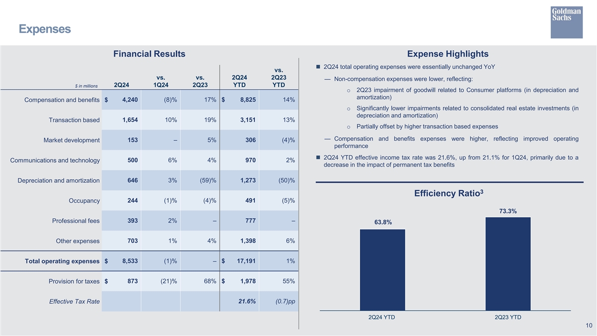 Expenses Financial Results Expense Highlights n 2Q24 total operating expenses were essentially unchanged YoY vs. vs. vs. 2Q24 2Q23 — Non-compensation expenses were lower, reflecting: 2Q24 1Q24 2Q23 YTD YTD $ in millions o 2Q23 impairment of goodwill related to Consumer platforms (in depreciation and amortization) Compensation and benefits $ 4,240 (8)% 17% $ 8,825 14% o Significantly lower impairments related to consolidated real estate investments (in depreciation and amortization) Transaction based 1,654 10% 19% 3,151 13% o Partially offset by higher transaction based expenses — Compensation and benefits expenses were higher, reflecting improved operating Market development 153 – 5% 306 (4)% performance n 2Q24 YTD effective income tax rate was 21.6%, up from 21.1% for 1Q24, primarily due to a Communications and technology 500 6% 4% 970 2% decrease in the impact of permanent tax benefits 646 3% (59)% 1,273 (50)% Depreciation and amortization 3 Efficiency Ratio Occupancy 244 (1)% (4)% 491 (5)% 73.3% Professional fees 393 2% – 777 – 63.8% Other expenses 703 1% 4% 1,398 6% Total operating expenses $ 8,533 (1)% – $ 17,191 1% 873 (21)% 68% $ 1,978 55% Provision for taxes $ Effective Tax Rate 21.6% (0.7)pp 2Q24 YTD 2Q23 YTD 10