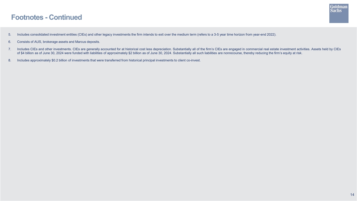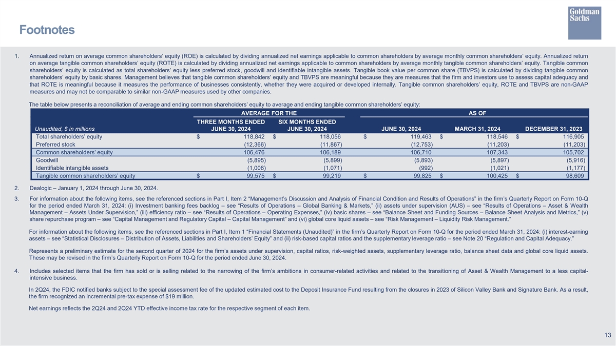 Footnotes 1. Annualized return on average common shareholders’ equity (ROE) is calculated by dividing annualized net earnings applicable to common shareholders by average monthly common shareholders’ equity. Annualized return on average tangible common shareholders’ equity (ROTE) is calculated by dividing annualized net earnings applicable to common shareholders by average monthly tangible common shareholders’ equity. Tangible common shareholders’ equity is calculated as total shareholders’ equity less preferred stock, goodwill and identifiable intangible assets. Tangible book value per common share (TBVPS) is calculated by dividing tangible common shareholders’ equity by basic shares. Management believes that tangible common shareholders’ equity and TBVPS are meaningful because they are measures that the firm and investors use to assess capital adequacy and that ROTE is meaningful because it measures the performance of businesses consistently, whether they were acquired or developed internally. Tangible common shareholders’ equity, ROTE and TBVPS are non-GAAP measures and may not be comparable to similar non-GAAP measures used by other companies. The table below presents a reconciliation of average and ending common shareholders’ equity to average and ending tangible common shareholders’ equity: AVERAGE FOR THE AS OF THREE MONTHS ENDED SIX MONTHS ENDED Unaudited, $ in millions JUNE 30, 2024 JUNE 30, 2024 JUNE 30, 2024 MARCH 31, 2024 DECEMBER 31, 2023 Total shareholders’ equity $ 118,842 $ 118,056 $ 119,463 $ 118,546 $ 116,905 Preferred stock (12,366) (11,867) (12,753) (11,203) (11,203) Common shareholders’ equity 106,476 106,189 106,710 107,343 105,702 Goodwill (5,895) (5,899) (5,893) (5,897) (5,916) Identifiable intangible assets (1,006) (1,071) (992) (1,021) (1,177) Tangible common shareholders’ equity $ 99,575 $ 99,219 $ 99,825 $ 100,425 $ 98,609 2. Dealogic – January 1, 2024 through June 30, 2024. 3. For information about the following items, see the referenced sections in Part I, Item 2 “Management’s Discussion and Analysis of Financial Condition and Results of Operations” in the firm’s Quarterly Report on Form 10-Q for the period ended March 31, 2024: (i) Investment banking fees backlog – see “Results of Operations – Global Banking & Markets,” (ii) assets under supervision (AUS) – see “Results of Operations – Asset & Wealth Management – Assets Under Supervision,” (iii) efficiency ratio – see “Results of Operations – Operating Expenses,” (iv) basic shares – see “Balance Sheet and Funding Sources – Balance Sheet Analysis and Metrics,” (v) share repurchase program – see “Capital Management and Regulatory Capital – Capital Management” and (vi) global core liquid assets – see “Risk Management – Liquidity Risk Management.” For information about the following items, see the referenced sections in Part I, Item 1 “Financial Statements (Unaudited)” in the firm’s Quarterly Report on Form 10-Q for the period ended March 31, 2024: (i) interest-earning assets – see “Statistical Disclosures – Distribution of Assets, Liabilities and Shareholders’ Equity” and (ii) risk-based capital ratios and the supplementary leverage ratio – see Note 20 “Regulation and Capital Adequacy.” Represents a preliminary estimate for the second quarter of 2024 for the firm’s assets under supervision, capital ratios, risk-weighted assets, supplementary leverage ratio, balance sheet data and global core liquid assets. These may be revised in the firm’s Quarterly Report on Form 10-Q for the period ended June 30, 2024. 4. Includes selected items that the firm has sold or is selling related to the narrowing of the firm’s ambitions in consumer-related activities and related to the transitioning of Asset & Wealth Management to a less capital- intensive business. In 2Q24, the FDIC notified banks subject to the special assessment fee of the updated estimated cost to the Deposit Insurance Fund resulting from the closures in 2023 of Silicon Valley Bank and Signature Bank. As a result, the firm recognized an incremental pre-tax expense of $19 million. Net earnings reflects the 2Q24 and 2Q24 YTD effective income tax rate for the respective segment of each item. 13